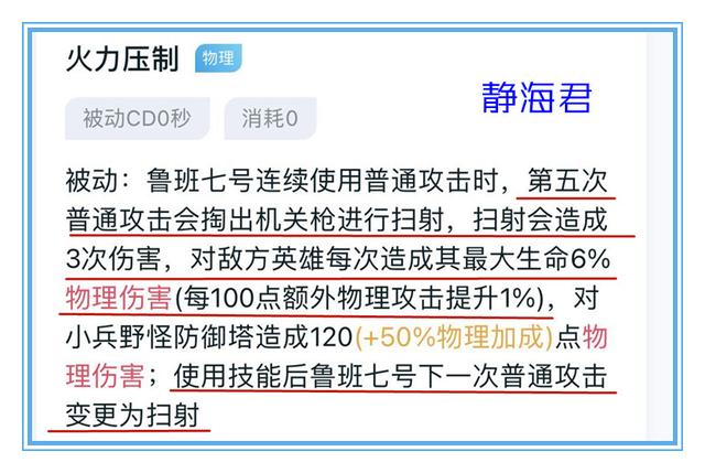 鲁班的被动实在太好用了,在连续普通攻击四次或者使用技能后,鲁班就可以触发扫射效果,这个扫射对于任何英雄来说都是毁灭性的打击,被装备成型的鲁班输出后很容易出现融化的现象。
