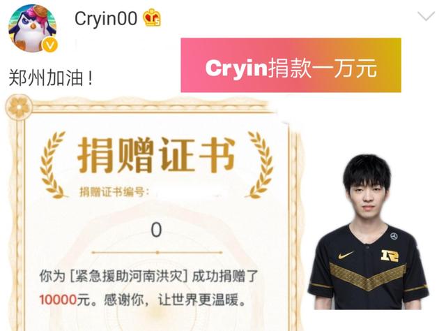 而且要知道Cryin平时十分的节俭,打职业几年也没有什么积蓄,一直以来都是扣扣搜搜的,衣服穿的都是小虎的,甚至请粉丝吃饭都得蹭小虎,但是就是这样的男孩,一下子捐出了一万元,让不少粉丝表示泪目。