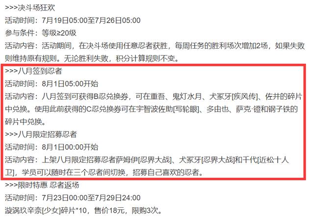 7月份已经接近尾声,很多玩家还在纳闷,为什么火影忍者手游还不公布8月份的签到忍者和限定忍者呢?我本来以为是魔方可能需要等到本周四的更新公告才会公布,没想到魔方其实早在上周就已经公布了,只不过很多玩家都没有注意,这个内容并不是出现在游戏内的公告中,而是在其他渠道的一个官方预告里。
