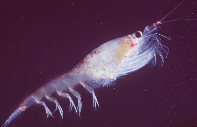 南极磷虾是磷虾科、磷虾属虾类,这与我们常见的虾类不一样,南极磷虾成虾也就只有45-60毫米长,最大的90毫米,所以是一种小虾了。南极磷虾只要生活在南冰洋,也就是我们说的“南大洋”,属于似虾的无脊椎动物,并以群集方式生活,有时密度达到每立方米10000-30000只,所以一个种群数量都非常大,