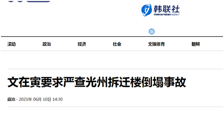 据韩联社消息,韩国青瓦台发言人朴炅美10日表示,韩国总统文在寅当天听取行政安全部长官全海澈和光州市市长李庸燮对光州市拆迁楼倒塌事故的报告,要求彻查真相,追究责任。