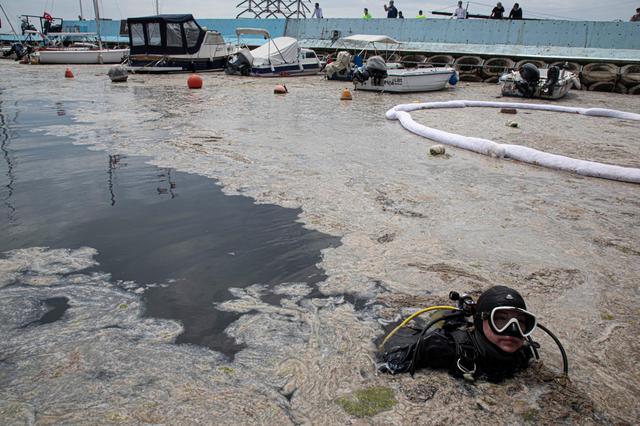 6月8日,在土耳其伊斯坦布尔附近的马尔马拉海岸,参与清理行动的潜水员调查水下情况。