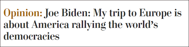 6月6日,拜登在《华盛顿邮报》发表署名文章,介绍了他参加G7峰会的相关行程。他还写道,“美国必须以强大的姿态领导世界”,以对抗“中国和俄罗斯的有害活动”。