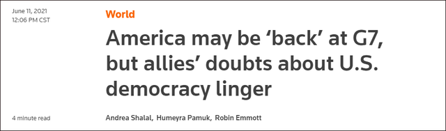 除经济原因外,“分裂”美国和盟友国家的另一个原因在于,特朗普已经让美国在全世界失去了信誉,G7其他国家正在质疑美国的民主程度。