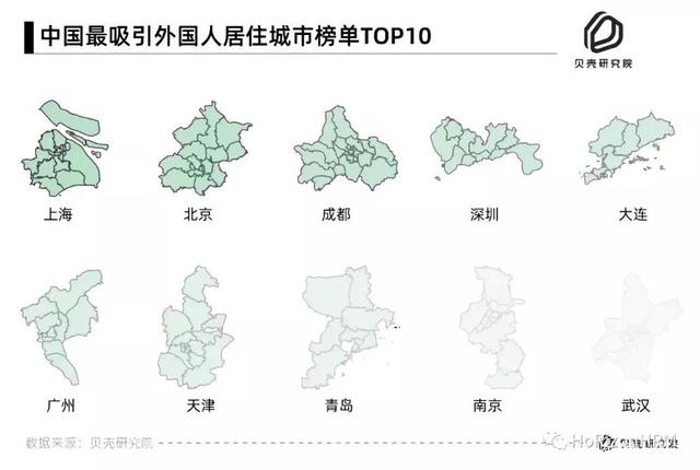 外国人居留许可和国内人才流动趋向一线城市一样,北上广深对外国友人的吸引力也很大,上海对外国友人居住吸引力最强,既有位于中部的武汉,也有深处西部的成都,而其他8个城市北起大连,南到深圳,均为东部沿海省份经济较为发达的城市。