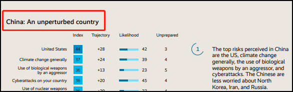 《慕尼黑安全报告》在分析中国数据时,以“中国:镇定的国家”(An unperturbed country)为标题。报告分析,民众对风险的感知水平较低,可能是中国人民对国家实力的信任的体现。并且,中国民众坚信,国家已经做好了应对风险的准备。