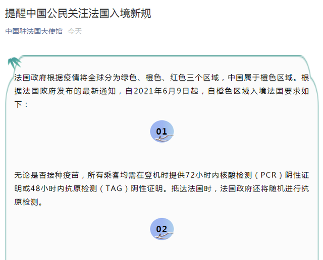 2.《[每日经济新闻]中国驻法国大使馆发布公告:提醒中国公民关注法国入境新规》仅供读者参考,本网站未对该内容进行证实,对其原创性、真实性、完整性、及时性不作任何保证。
