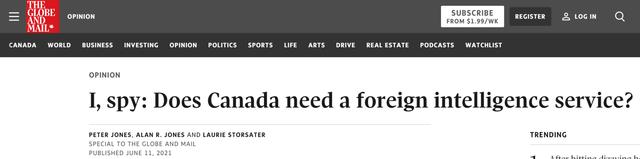 报道称,曾担任情报要职的三名加拿大政府前官员本月在加拿大最著名的全国大报上发文表示,加拿大政府应该探索专门建立一个类似于美国中央情报局(CIA)或英国军情六处(MI6)这种机构的可能性。