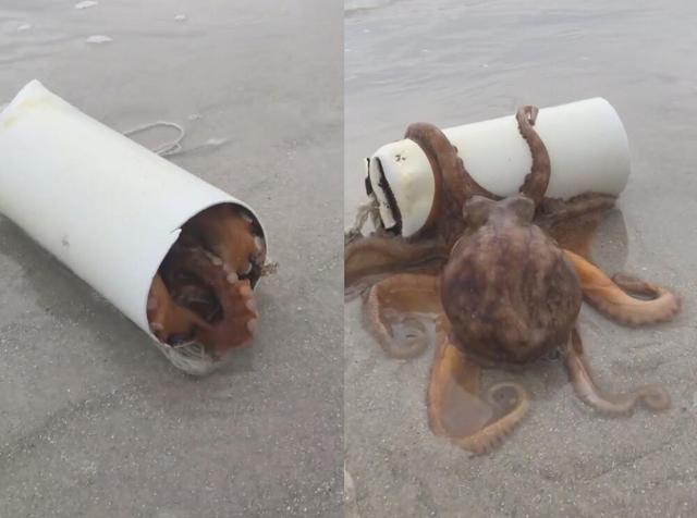 近日,澳大利亚海洋生物学家希瑞·玛瑞斯在海边散步时候,发现一只章鱼推着一个塑料管往海里去。