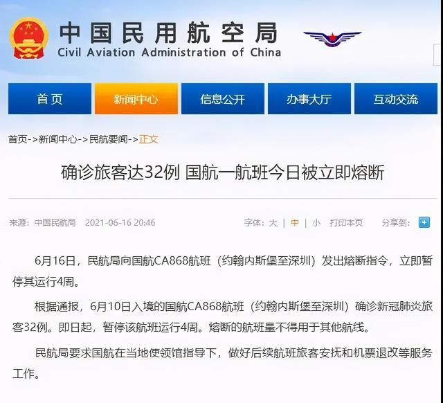 16日,民航局向国航CA868航班(约翰内斯堡至深圳)发出熔断指令,立即暂停其运行4周。