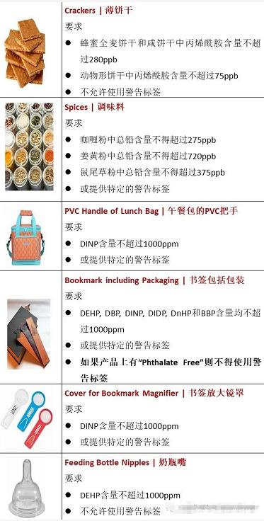 近期,加州65号提案又达成了一批和解协议,涉及某些食品(黑巧克力杏仁或核桃、蛋糕、面包、咖啡产品、糖蜜、甜菜片、可可粒、酒醋、海藻、凤尾鱼干、米头、饼干、香料)及其他消费品(午餐袋PVC提手、书签包括包装、书签放大镜盖、奶瓶嘴)等。