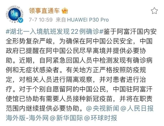 对于网友们的关心,外交部领事保护中心的回应称,鉴于阿富汗国内安全形势复杂严峻,为确保在阿中国公民安全,中国政府已提醒在阿中国公民尽早离境并提供必要协助,归国人员正严格按照防疫规定进行隔离观察,患者也正在进行治疗。