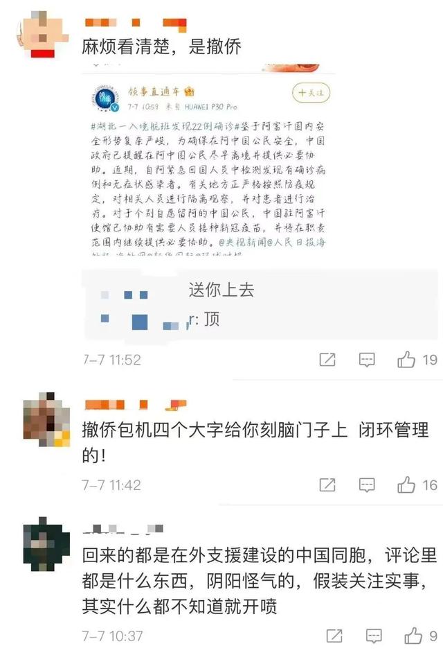 不少网友恍然大悟,原来这是协助在阿人员回国的“撤侨航班”;更有人表示,“看到撤侨这两个字就热泪盈眶了,无论身在何方,不要怕,在你身后,有一个强大的祖国!”