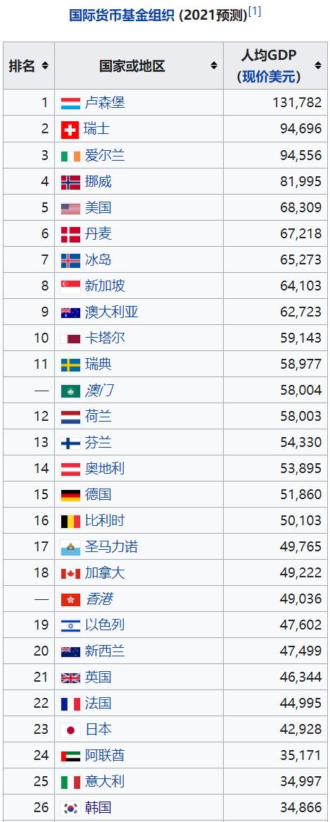 人均GDP是:34,866美元,位列第26。而世界银行统计的人均收入当中,韩国人均收入30,600美元,位列第26,属于高等收入的分组。在联合国开发计划署关于的人类发展指数的统计中,韩国的数据为0.911,位列第24,属于人类发展指数的国家。