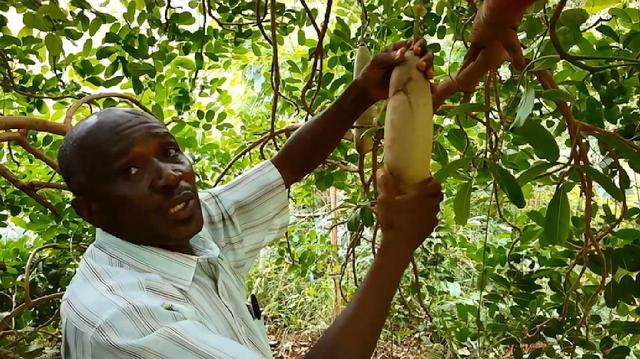 香肠树在非洲遍地都是,树高为六到十二米,成熟后的果子一个接一个长在一起,垂在树上,无论是从形状上还是长度上都像极了香肠,所以取名为“香肠树”。香肠树的果子一个能有十斤左右,吃到嘴巴里有一点点甜,口感还不错,这是因为里面很多淀粉。
