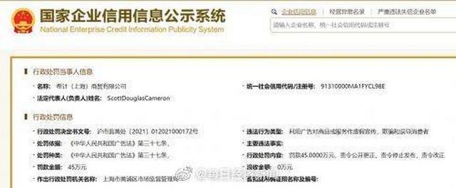 由国家企业信用信息公示网获悉,Canada Goose加拿大鹅关联公司希计(上海)商贸有限公司新增行政处罚,处罚事由为利用广告对商品或服务作虚假宣传,欺骗和误导消费者,处罚结果为罚款45万元,责令公开更正并停止发布。
