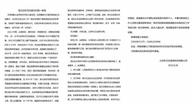 据时代周报,8月27日,在没有任何预兆的情况下,北京科贝乐教育科技有限公司(以下简称:北京科贝乐)突然在北京家长群里宣布,因2020年疫情期间停业,2021年复工以来面临巨额租金补缴以及疫情后巨额家长退费,已经累计举债2000余万元用于经营,现无力承担员工即刻要求的工资发放和会员全部退费,万般无奈被迫选择闭店,停止经营。