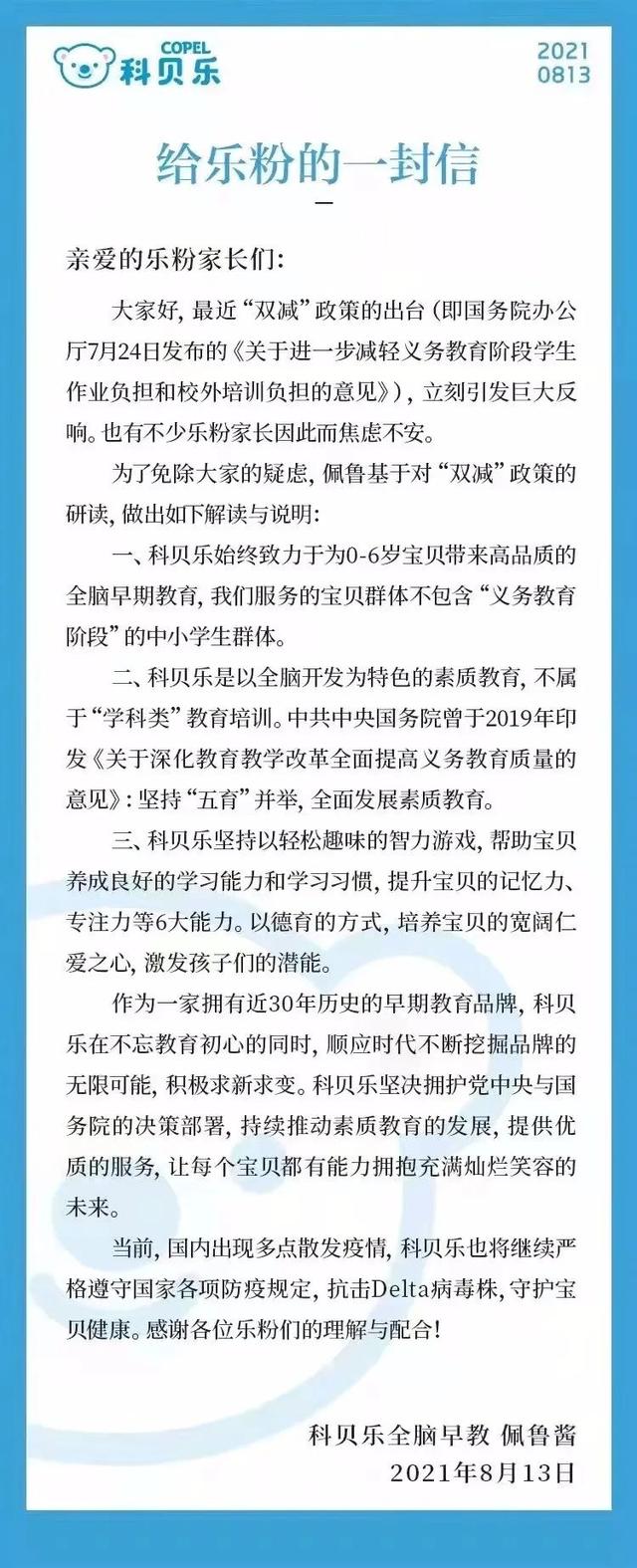 就在不久前的8月13日,科贝乐在《给乐粉的一封信》表示,“科贝乐服务的宝贝群体不包含‘义务教育阶段’的中小学生群体。科贝乐是以全脑开发为特色的素质教育,不属于‘学科类’教育培训。”