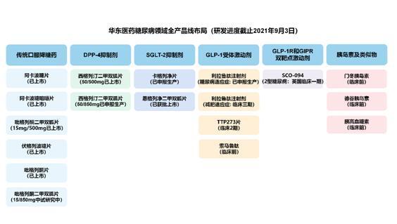 值得一提的是,华东医药深耕糖尿病用药领域近二十年,积累了良好的品牌效应和雄厚的市场基础,产品市场占有率持续保持国内同类产品前列。随着产品管线的不断丰富,公司在糖尿病领域已完成了创新靶点加差异化仿制药的整体布局,从仿制+创新+生物大分子三个维度,构筑了逐步升级、对核心治疗靶点与临床主流用药全布局的产品矩阵,现有及后续升级产品涵盖a-糖苷酶抑制剂、DPP-4i(二肽基肽酶Ⅳ抑制剂)、SGLT-2i(钠-葡萄糖共转运蛋白2抑制剂)、GLP-1R(人胰高血糖素样肽-1受体激动剂)以及GLP-1R等多项临床主流靶点。