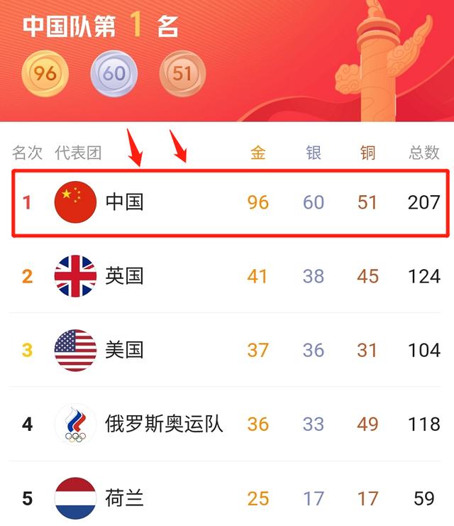 咱们中国队员们的表现更是成为了全世界关注的焦点,因为此次咱们中国队的金牌数与奖牌数都呈现断层式第一。此次排在榜单第2名的英国代表队一共斩获了124枚奖牌,分别是41枚金牌+38枚银牌+45枚铜牌。咱们中国队则是成为了唯一一支金牌数超过90枚+奖牌数超过200枚的代表队,与此同时也是唯一一支银牌数超过60枚+铜牌数超过50枚的代表队!