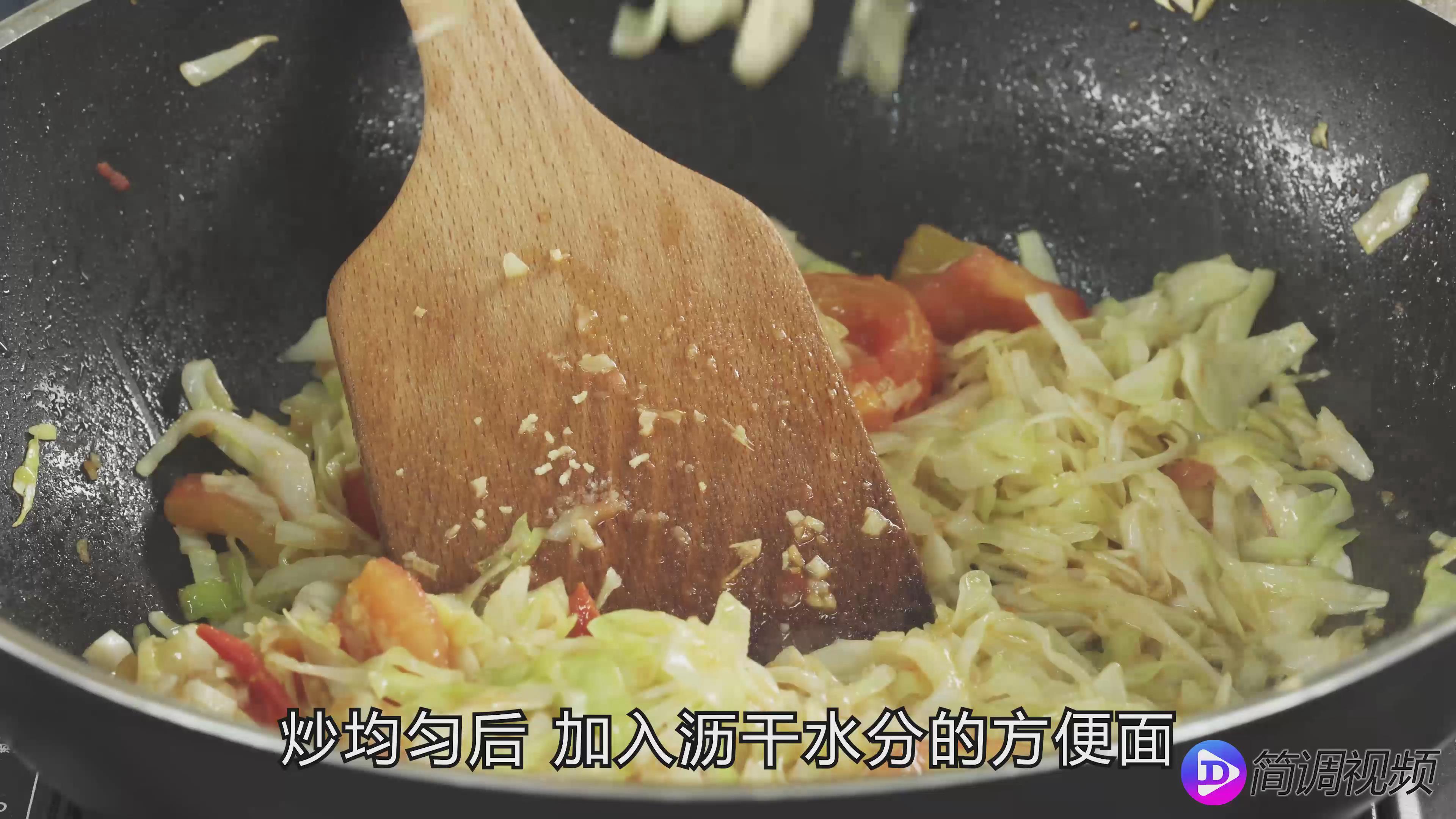 第四步:锅热倒油,放入姜蒜爆香,放入西红柿炒软,再放入白菜翻炒均匀,然后放入沥干的方便面小火翻炒均匀,最后放入鸡蛋翻炒几下出锅。
