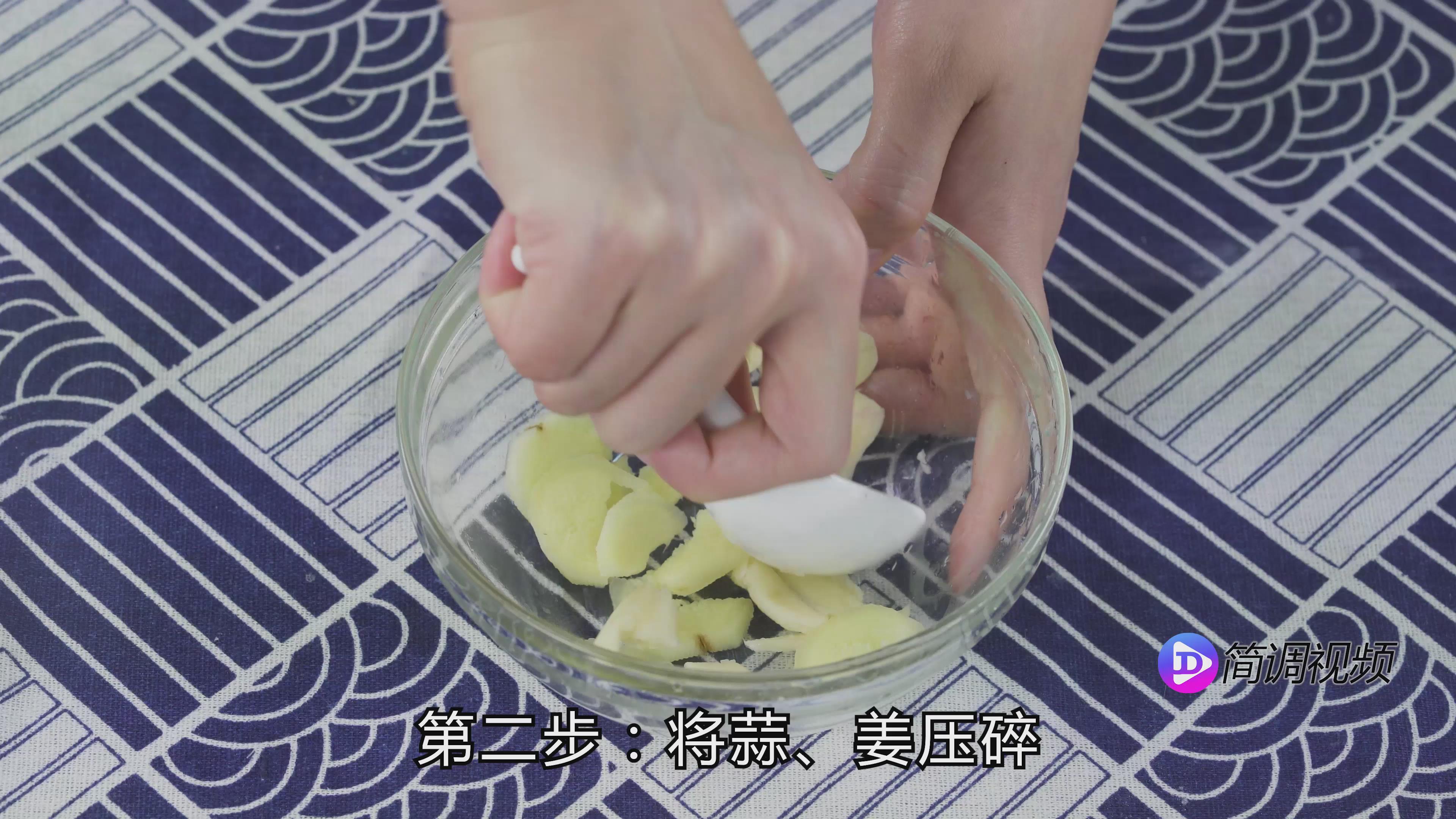 第二步:将大蒜和生姜碾碎,然后加入盐、胡椒粉、糖和蚝油调味,拌匀。