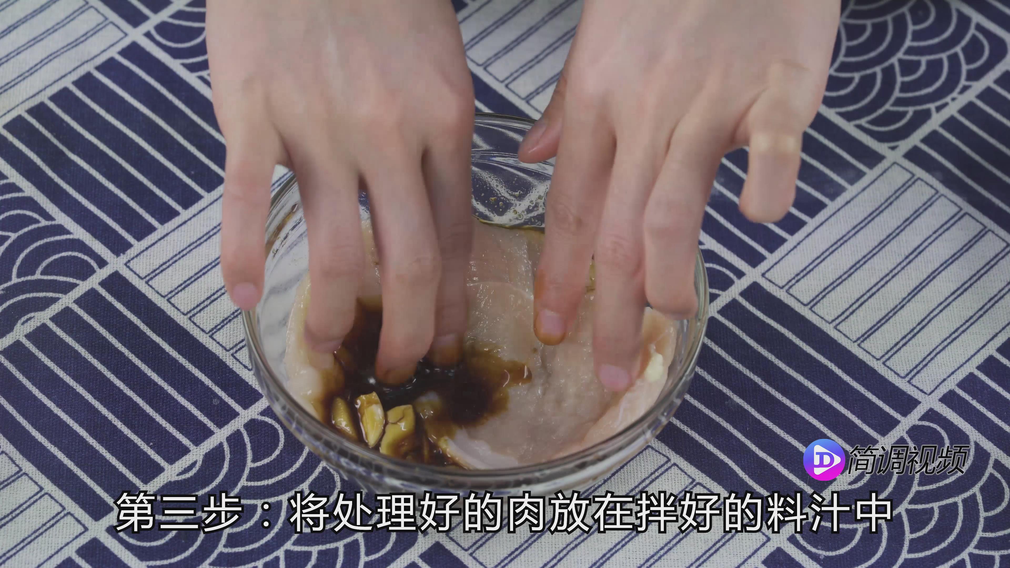 第三步:将处理好的肉放入混合酱中,用手轻轻揉搓,腌制1小时。