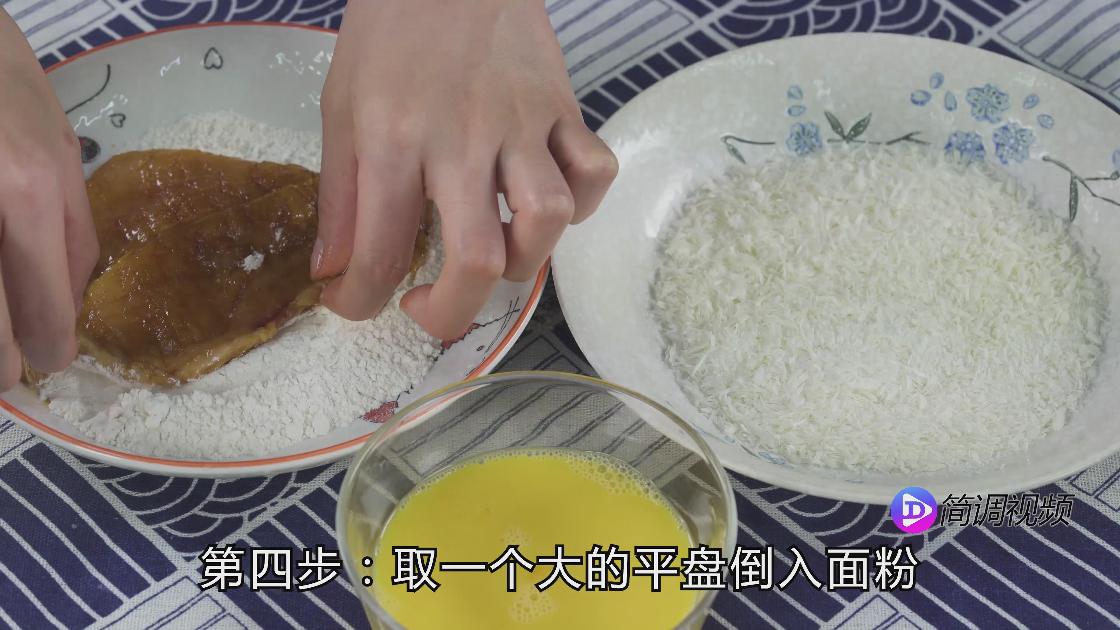 第四步:将面粉倒入一个大平盘中,在腌制好的鸡肉上均匀的粘上一层面粉,然后裹上打好的蛋液,裹上蛋液后再粘上一层面包屑。