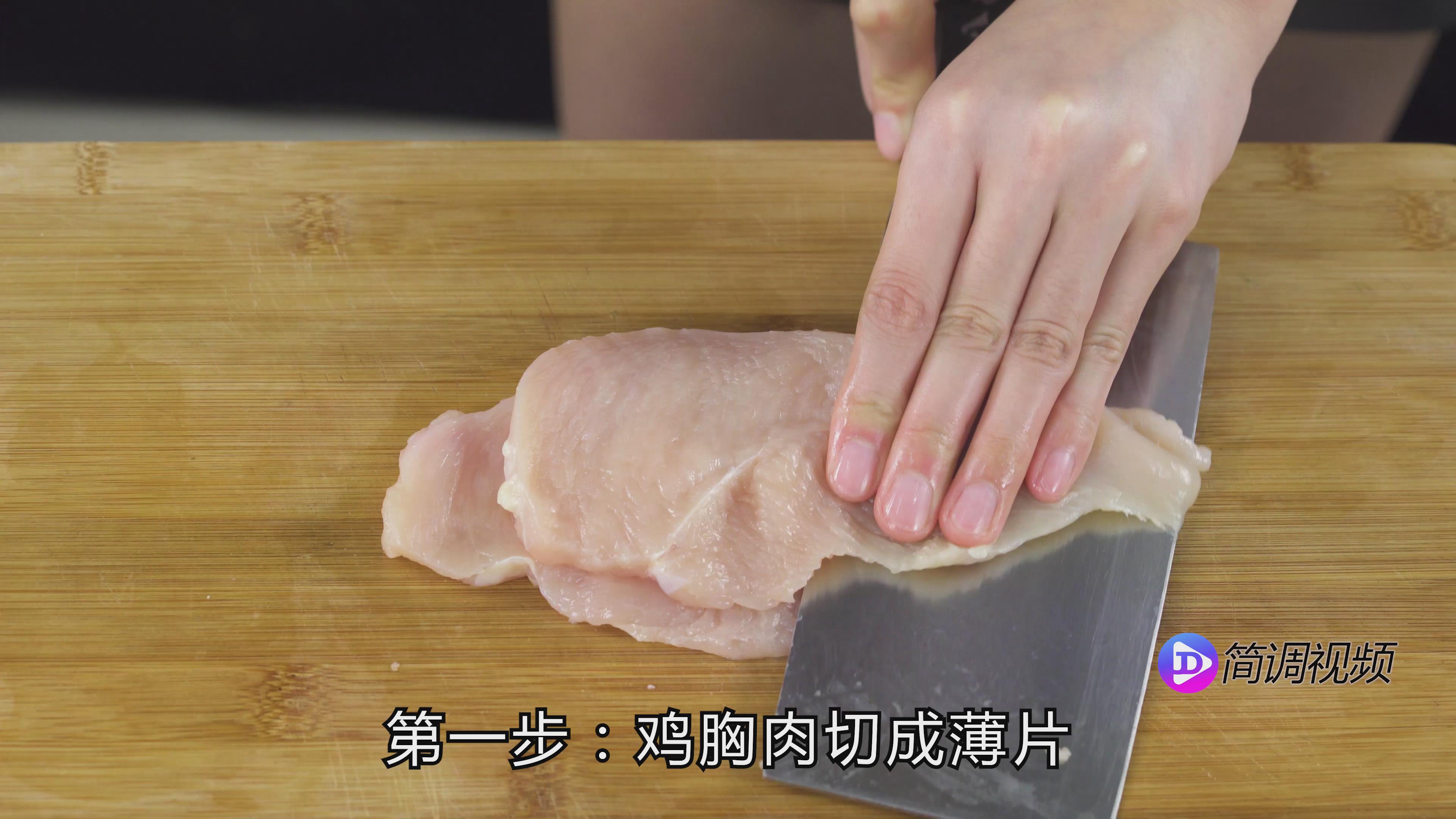 第一步:将鸡胸肉切成薄片,用刀背拍打切好的鸡胸肉,直到体积增大1.5-2倍左右。