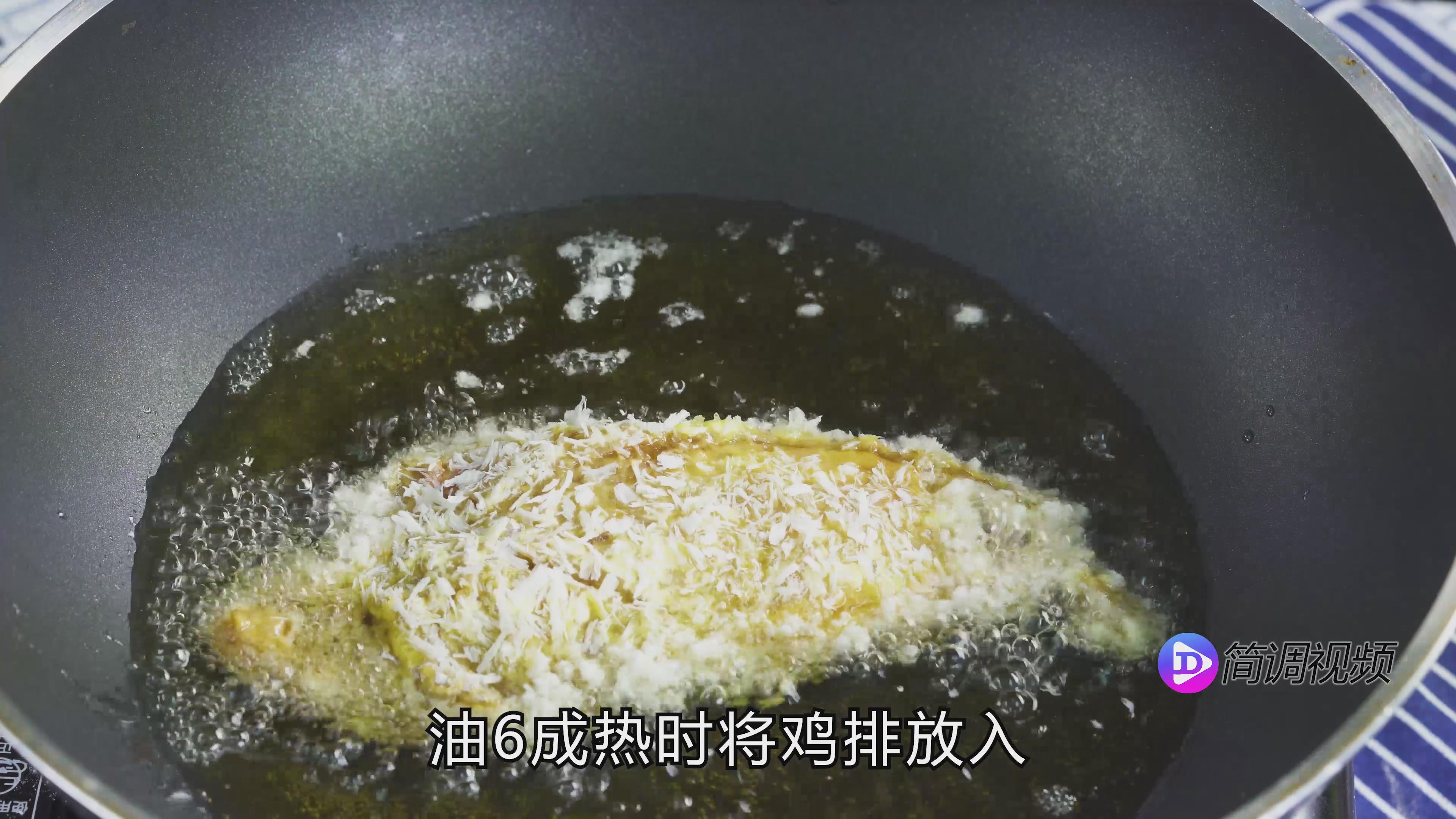 第五步:锅中倒入适量的油,以便覆盖鸡排。油六成热时,沥干鸡肉,中小火煎至两面金黄。