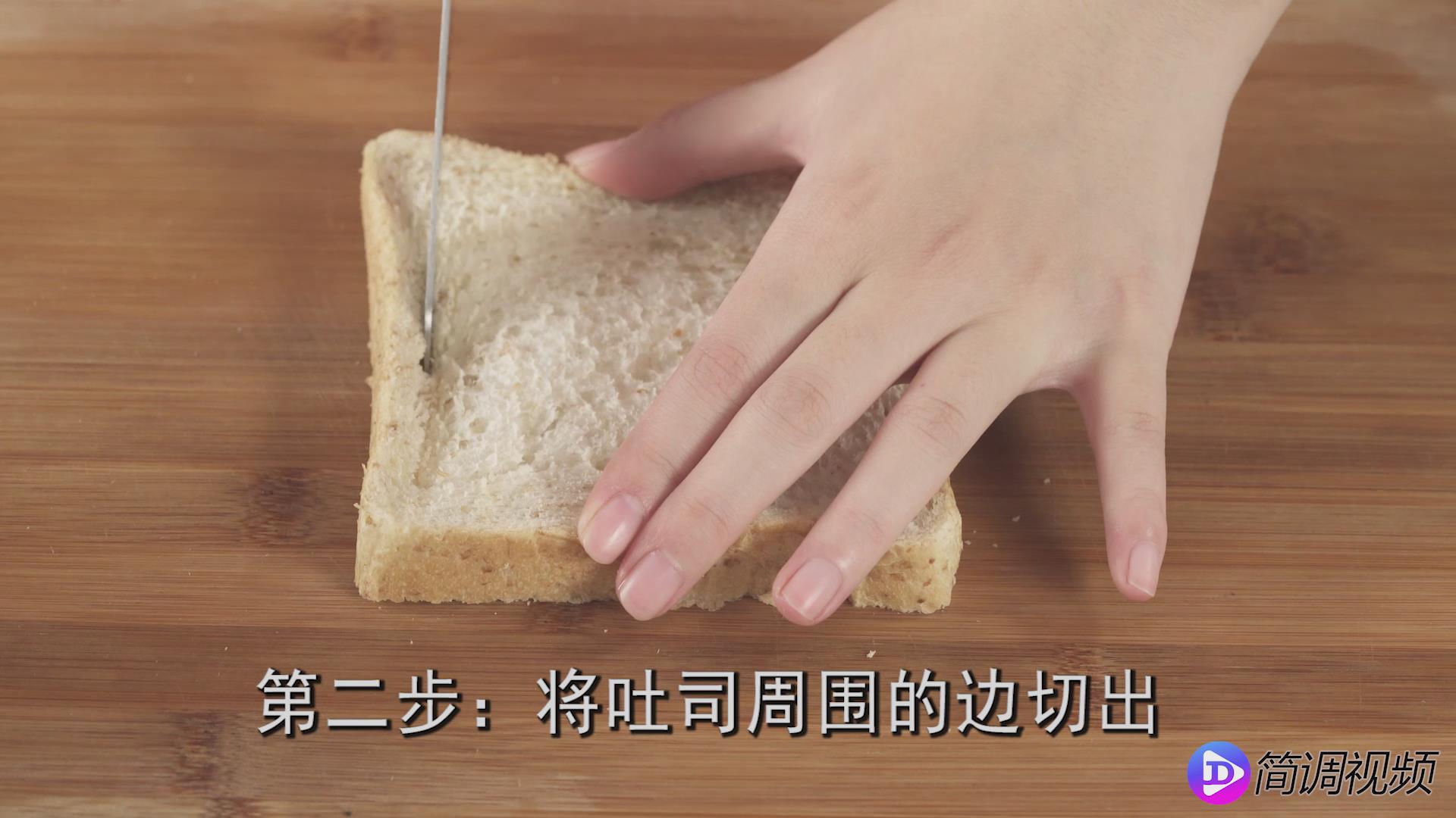 第二步:切掉烤面包周围的边缘,然后去中间部分,在锅里煎一小会儿。