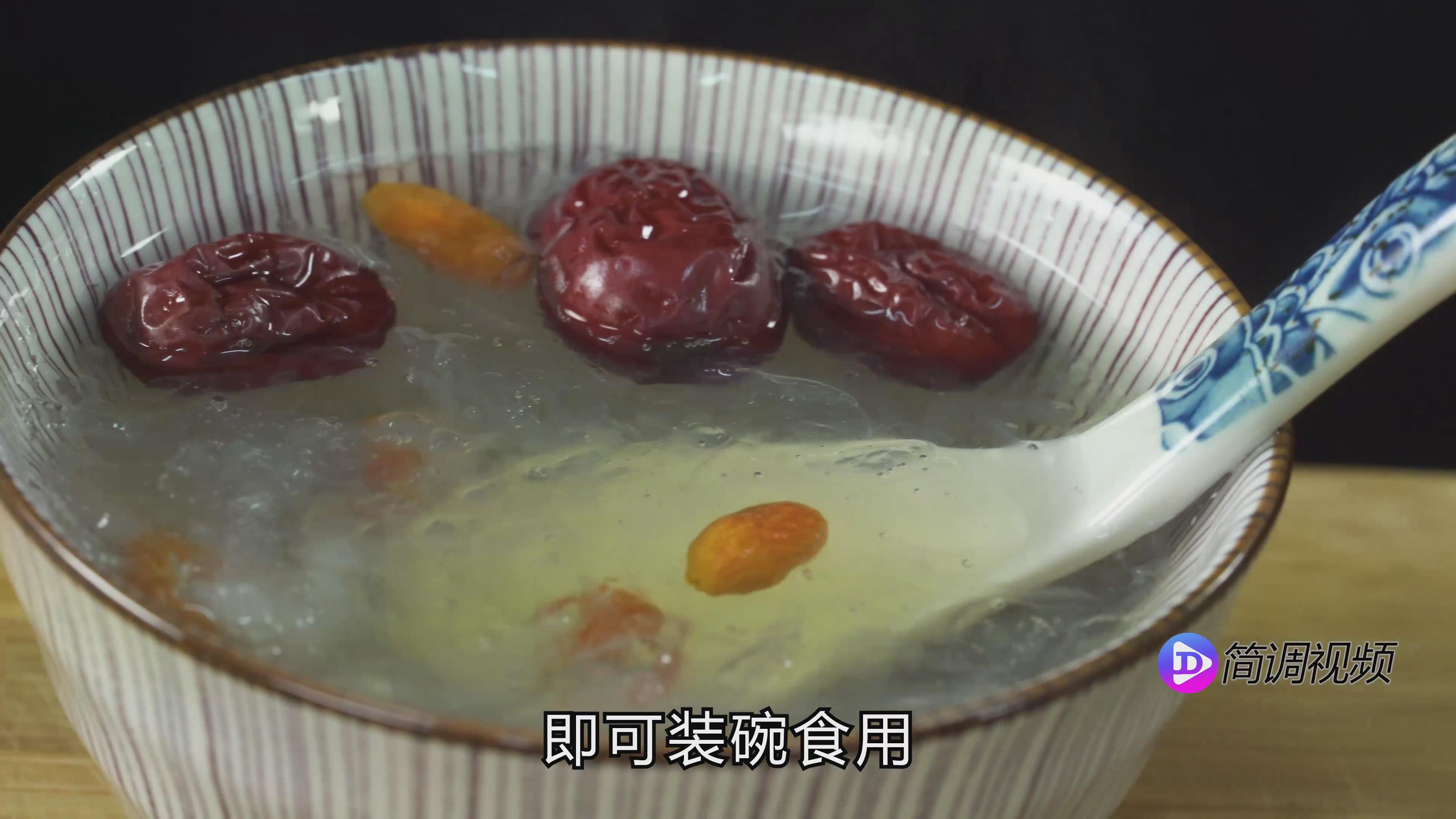 第三步:在燕窝中加入红枣、枸杞、冰糖,盖上盖子继续炖10分钟后盛入碗中。