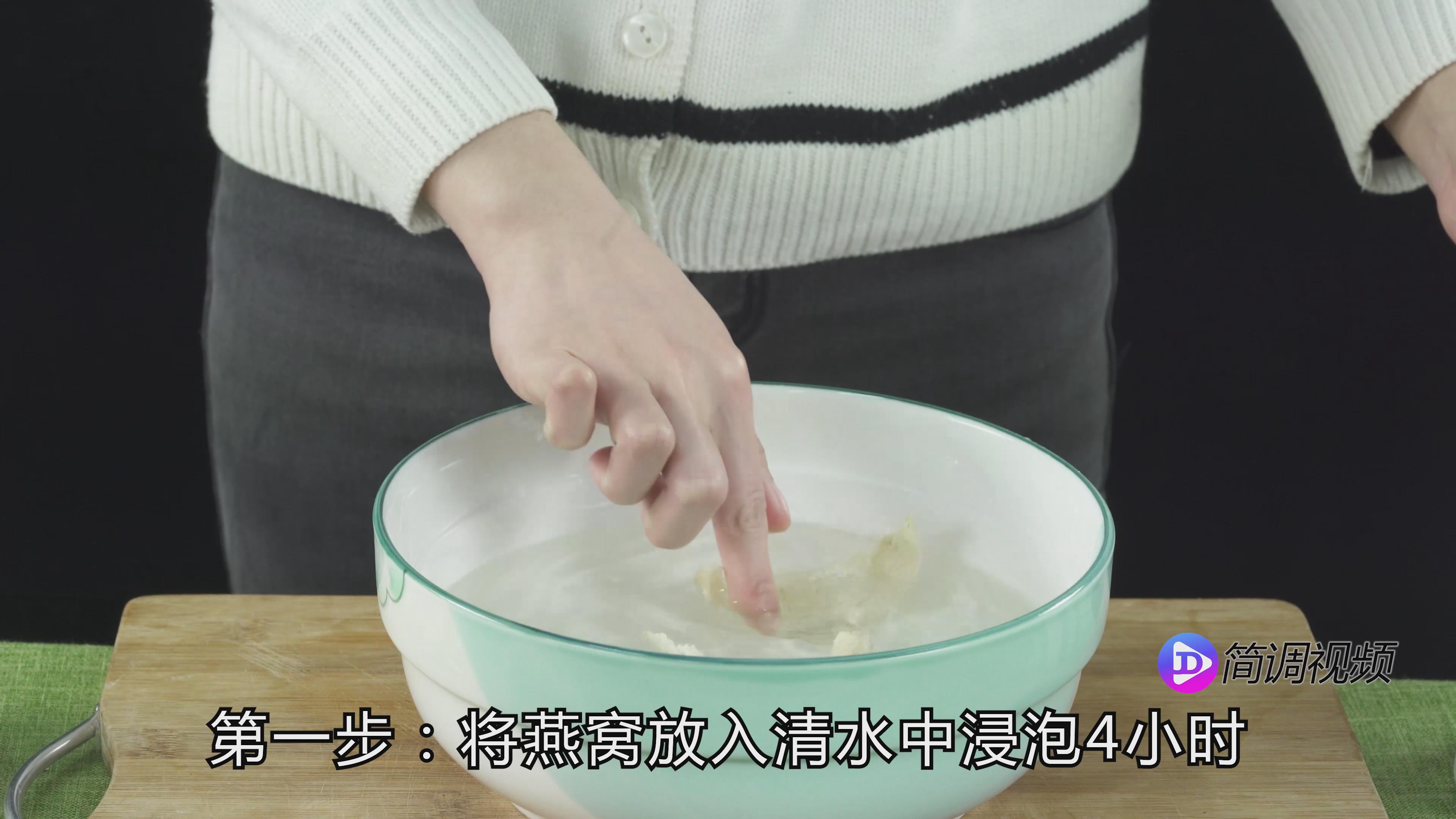 第一步:将燕窝用清水浸泡4小时,然后将浸泡过的燕窝顺着纹理撕成细丝,再用清水洗两遍,去除杂质。