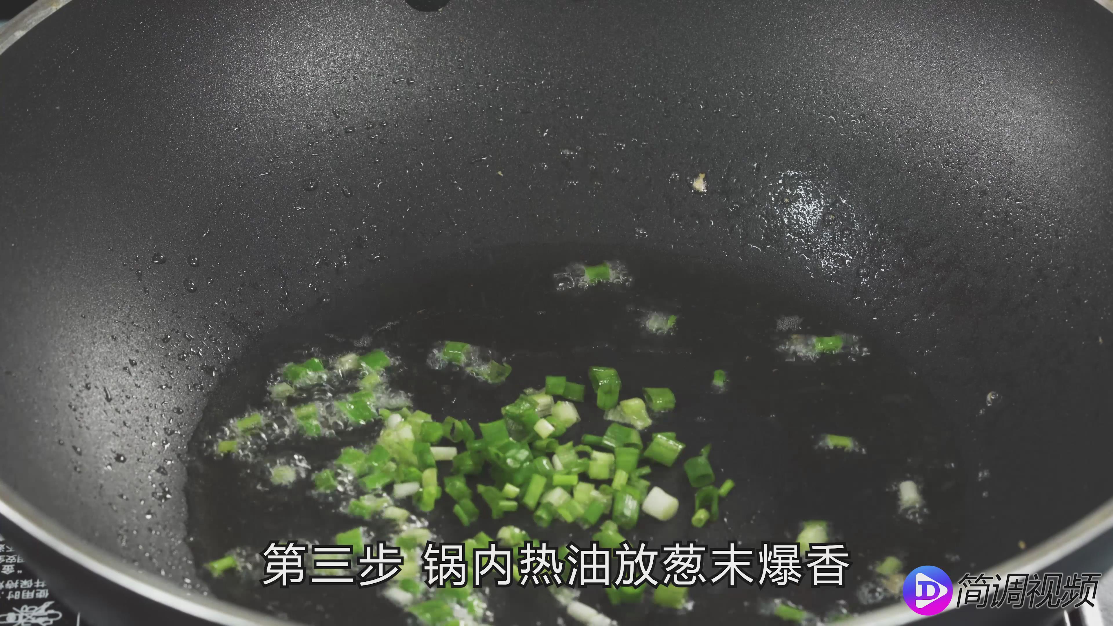 第三步:锅中热油,放入葱花炒香,然后放入火腿片和萝卜丁,快速翻炒5分钟,然后倒入米饭翻炒均匀。