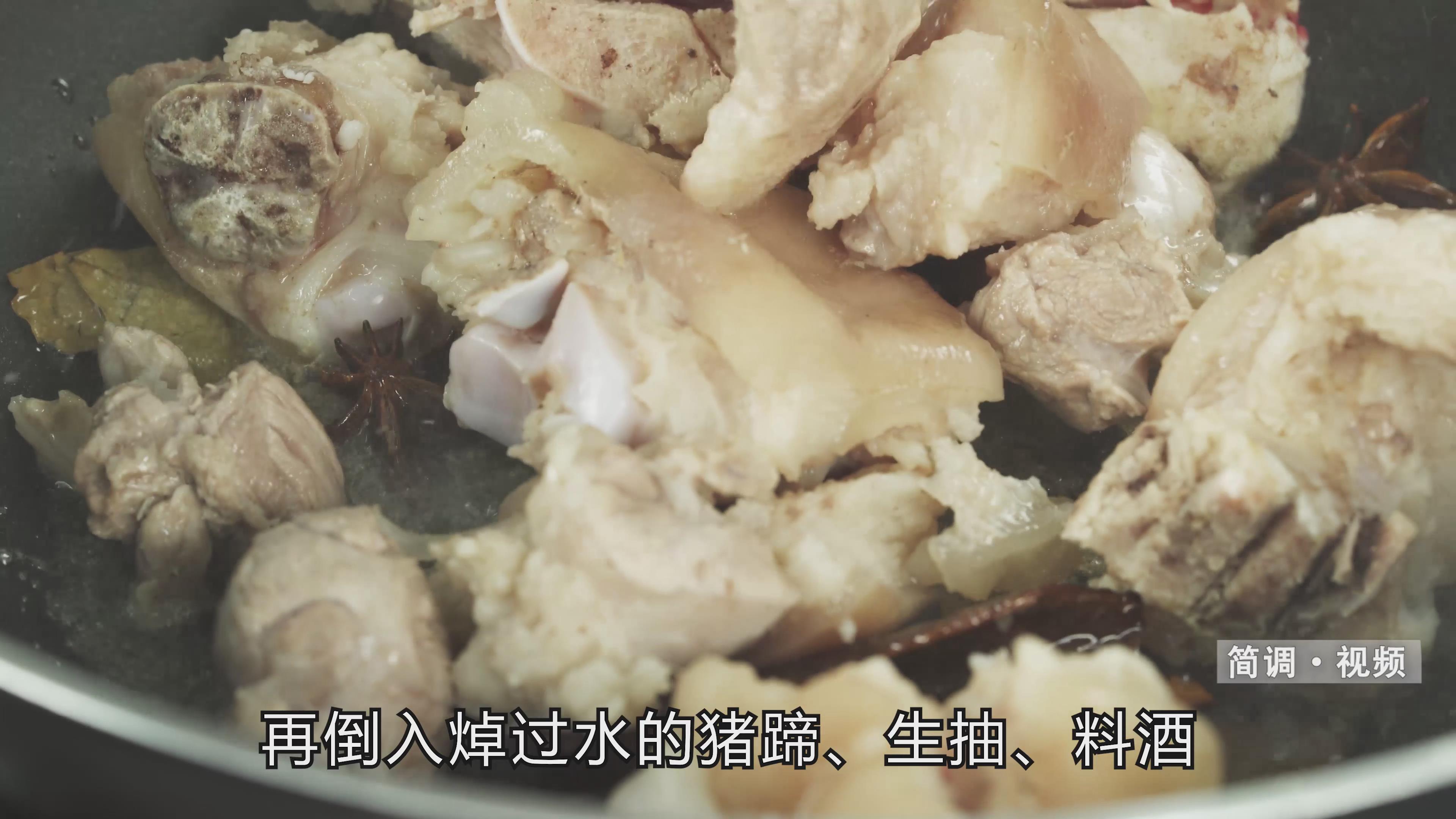 第三步;锅中热油,放入花椒、八角、桂皮、香叶、白糖,然后倒入焯水的猪蹄、酱油、料酒,再加水至水没过猪蹄,搅拌均匀,大火烧开后转小火,加盖焖至收汁,装盘即可。