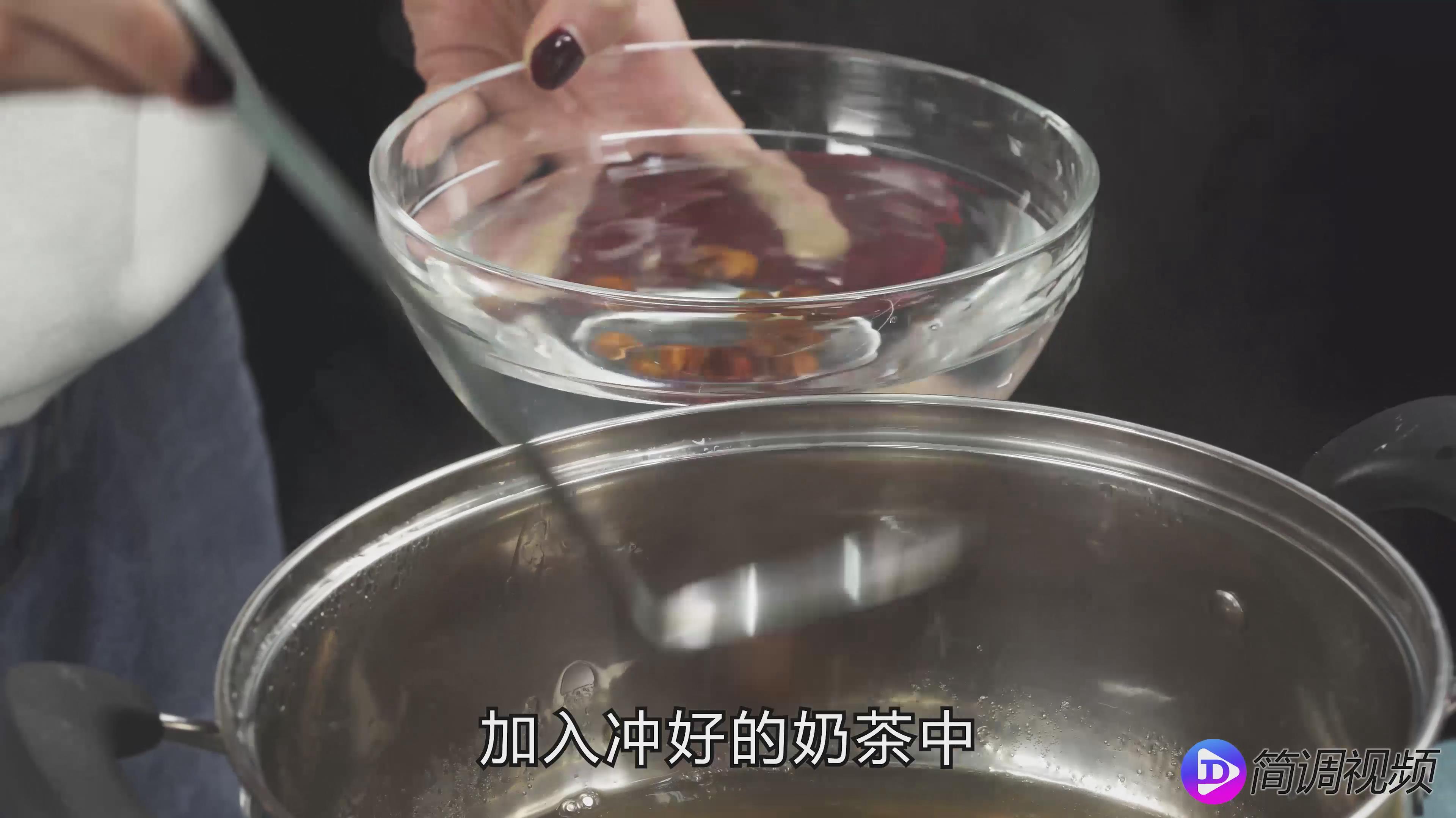 第六步:将煮好的珍珠加入冲泡好的奶茶中,搅拌均匀即可饮用。