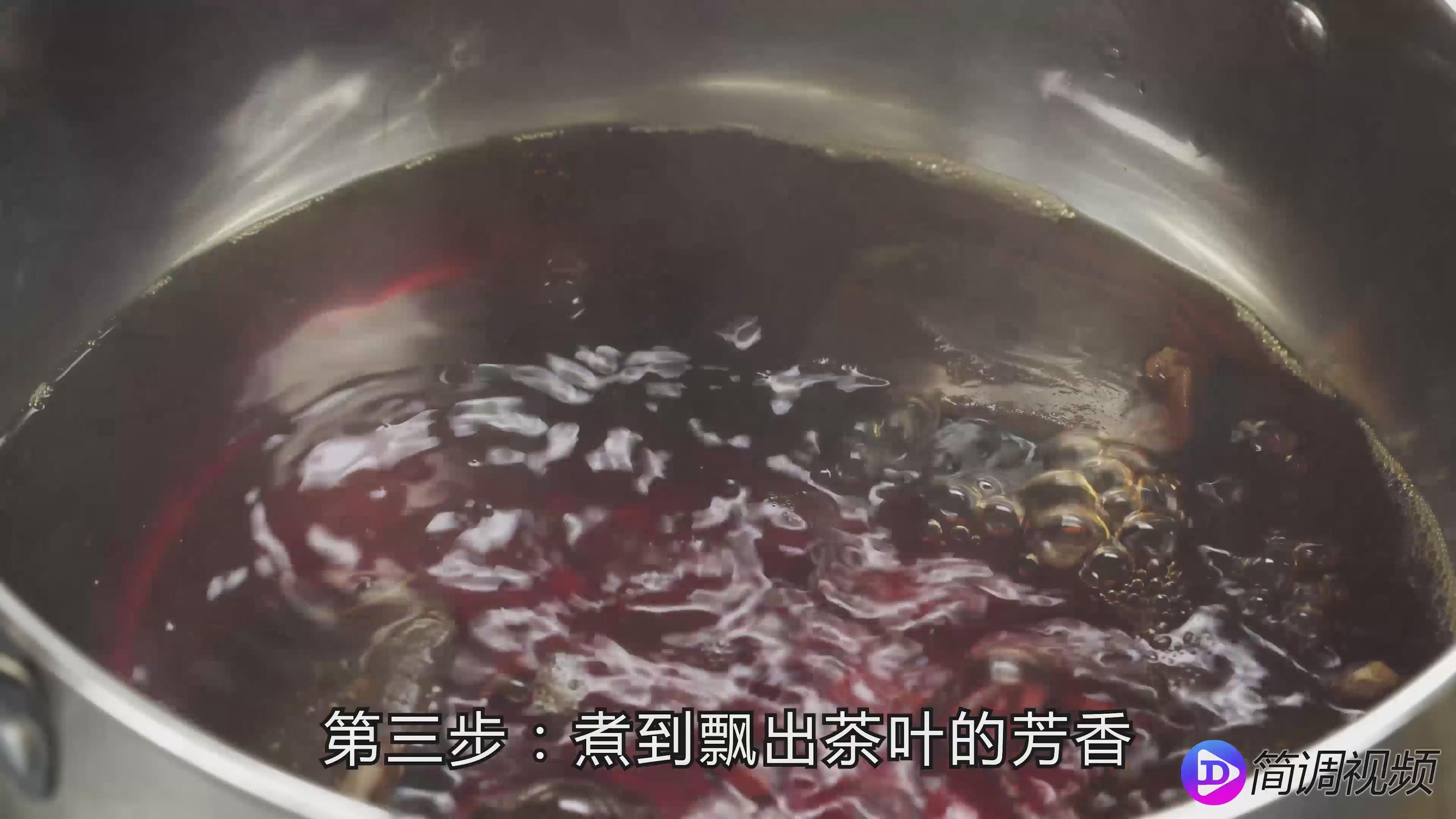 第三步:煮至茶叶香气四溢,再倒入牛奶和糖浆,搅拌均匀,小火煮5分钟,放入杯中备用。