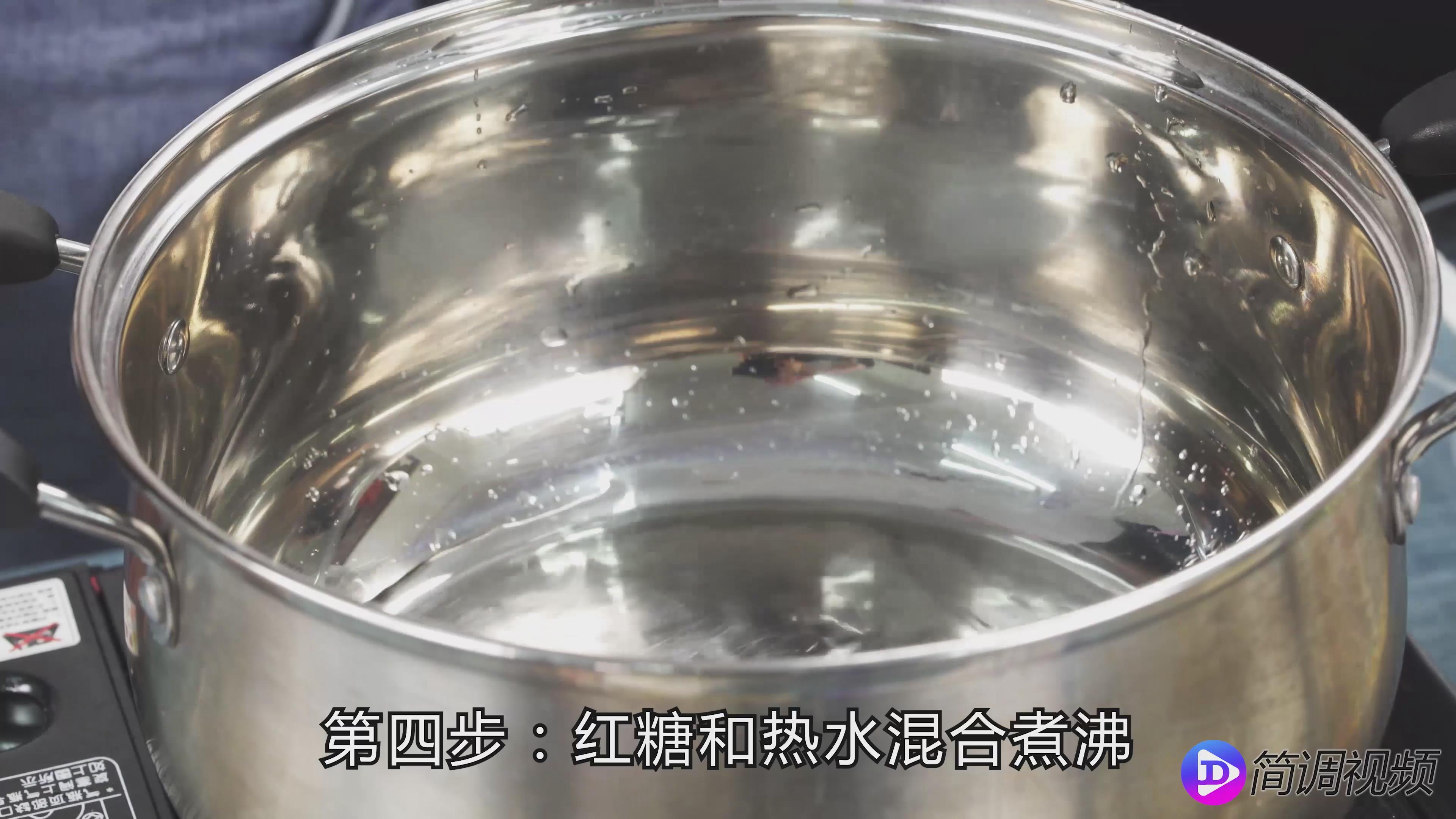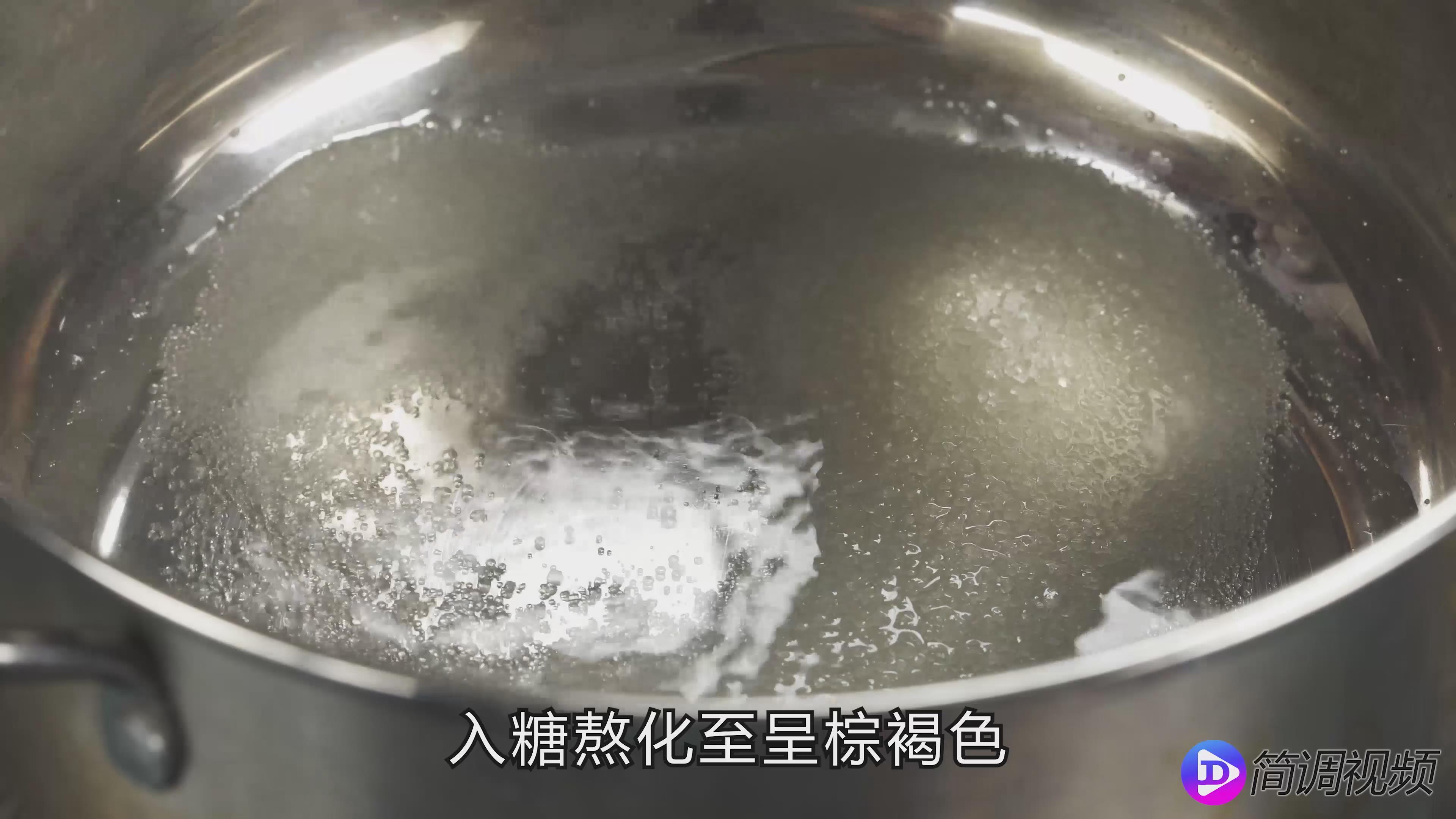第一步:锅中加水,大火加热,然后转小火,加入糖,煮至棕色,装袋备用。