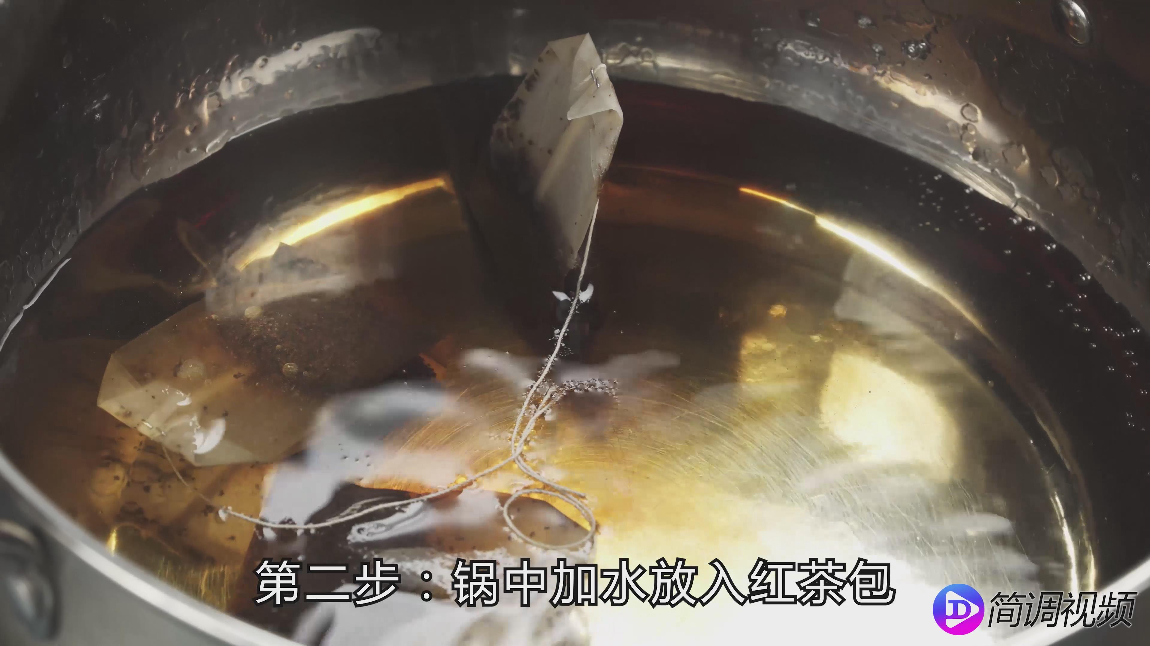 第二步:锅中加水,放入红茶包。大火煮开后,转小火煮一会儿。