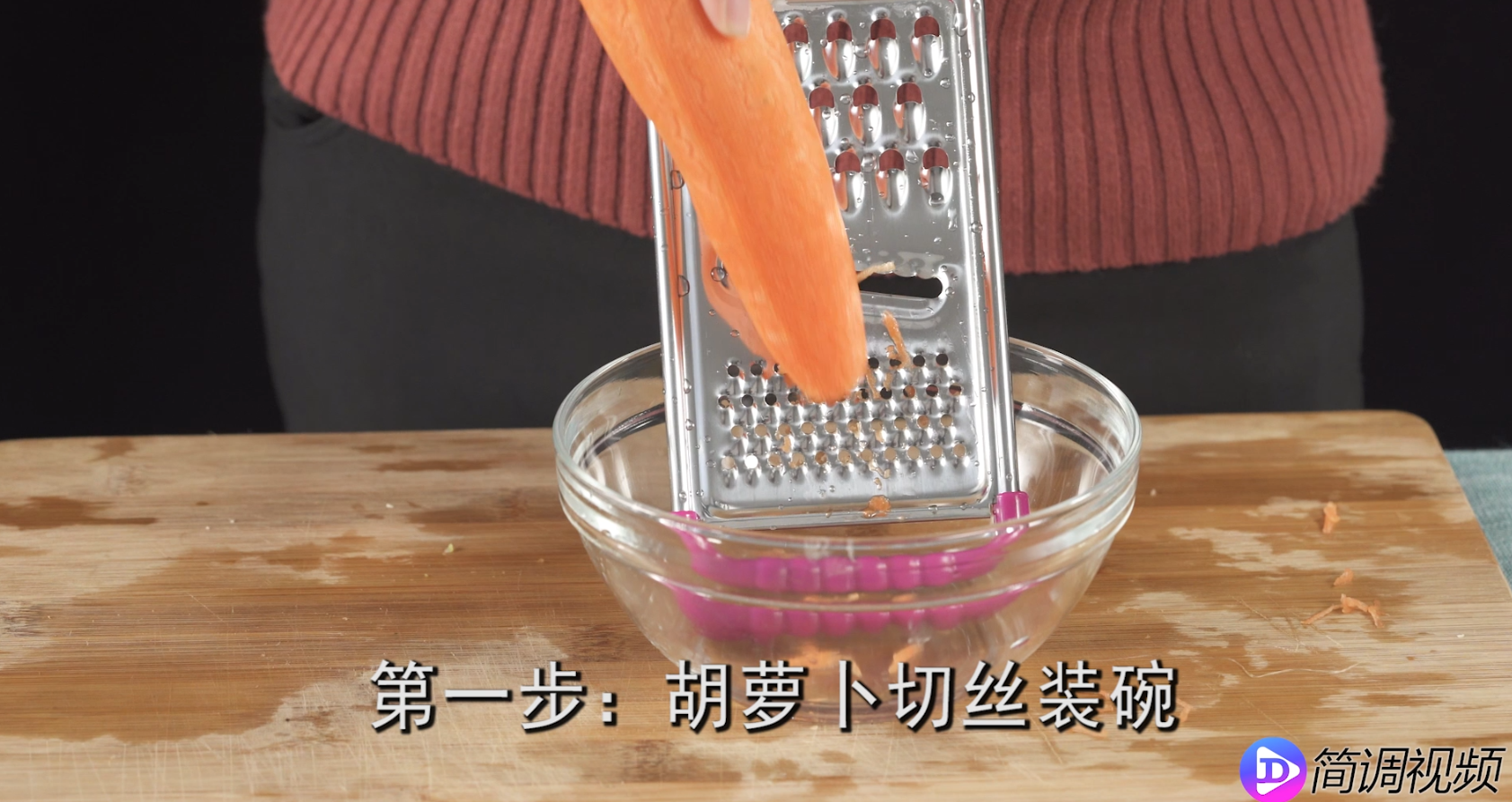 第一步,胡萝卜切丝,放入碗中;将芹菜切碎;玉米去皮;香菇泡发,切粒;将黑木耳切碎;将蔬菜切块,方便炒菜;彻底搅拌鸡蛋,把它们打碎。