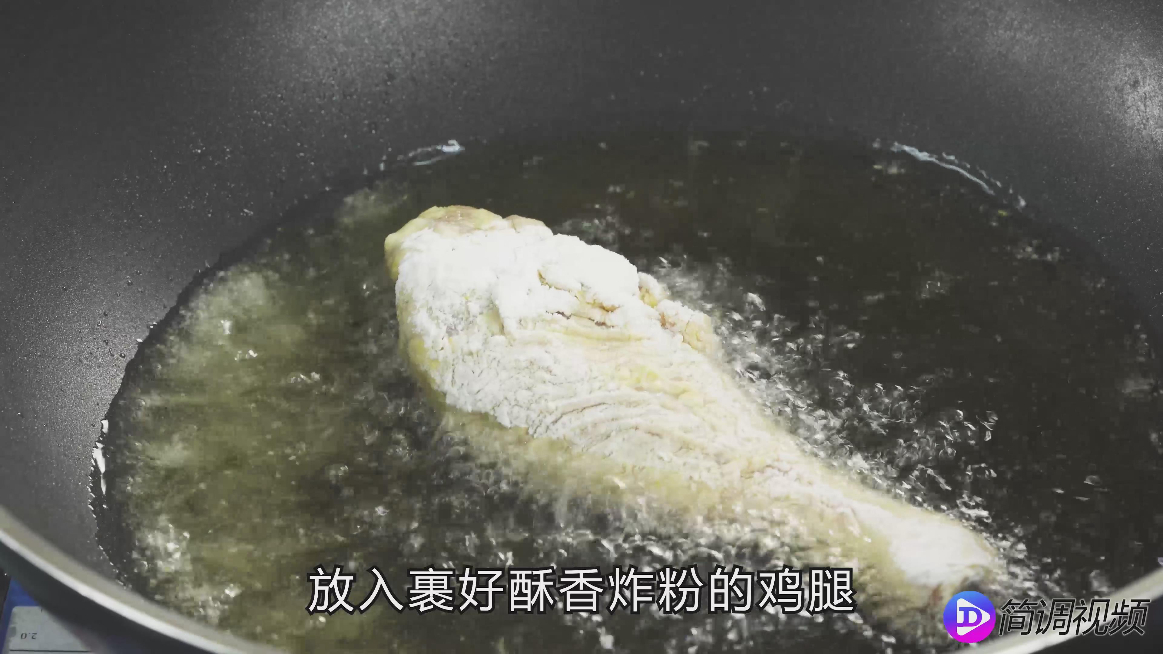第二步:将腌制好的鸡腿裹上香酥炸粉。