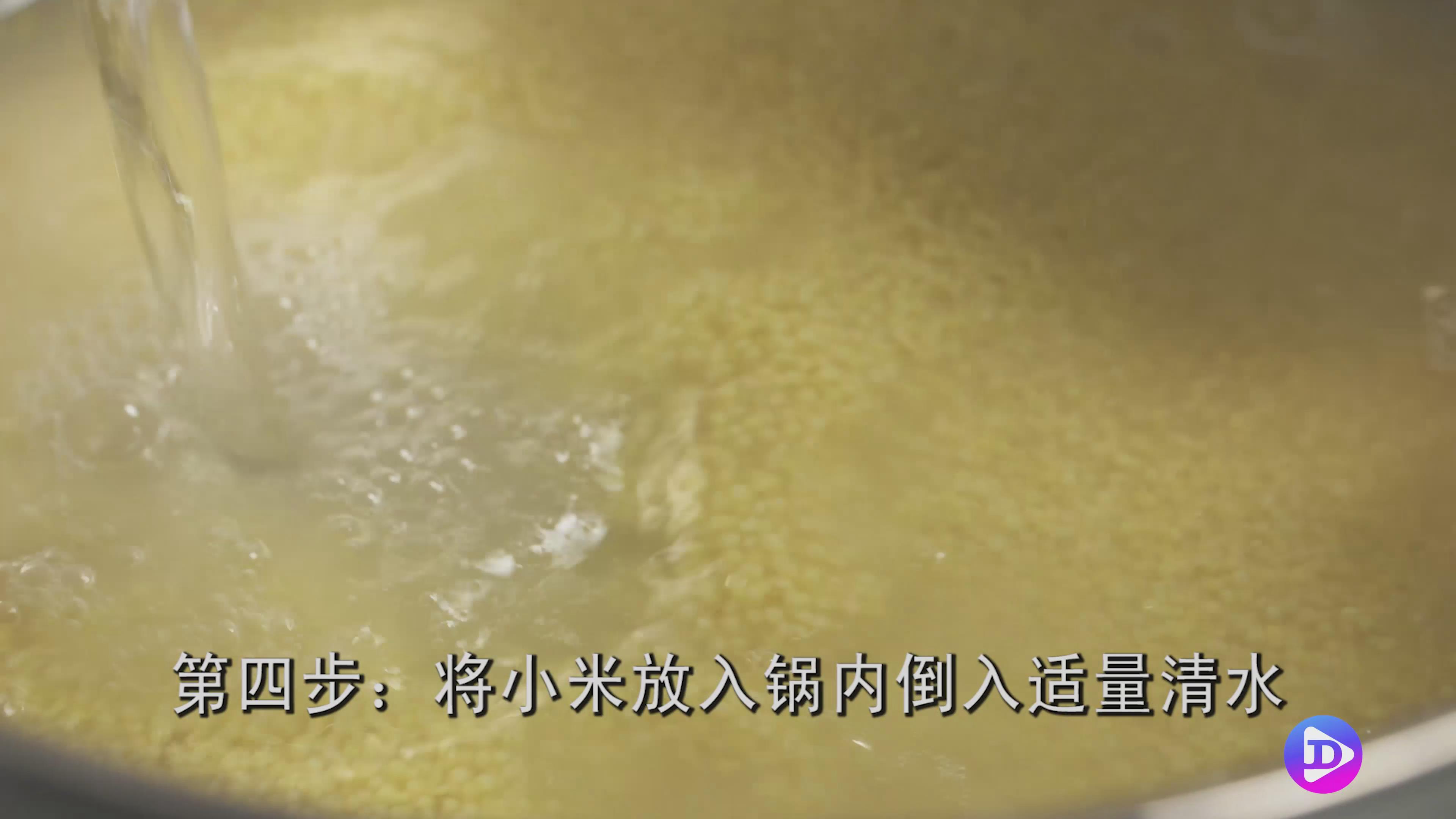 第四步:将小米放入锅中,倒入适量清水,盖上锅盖,大火煮。