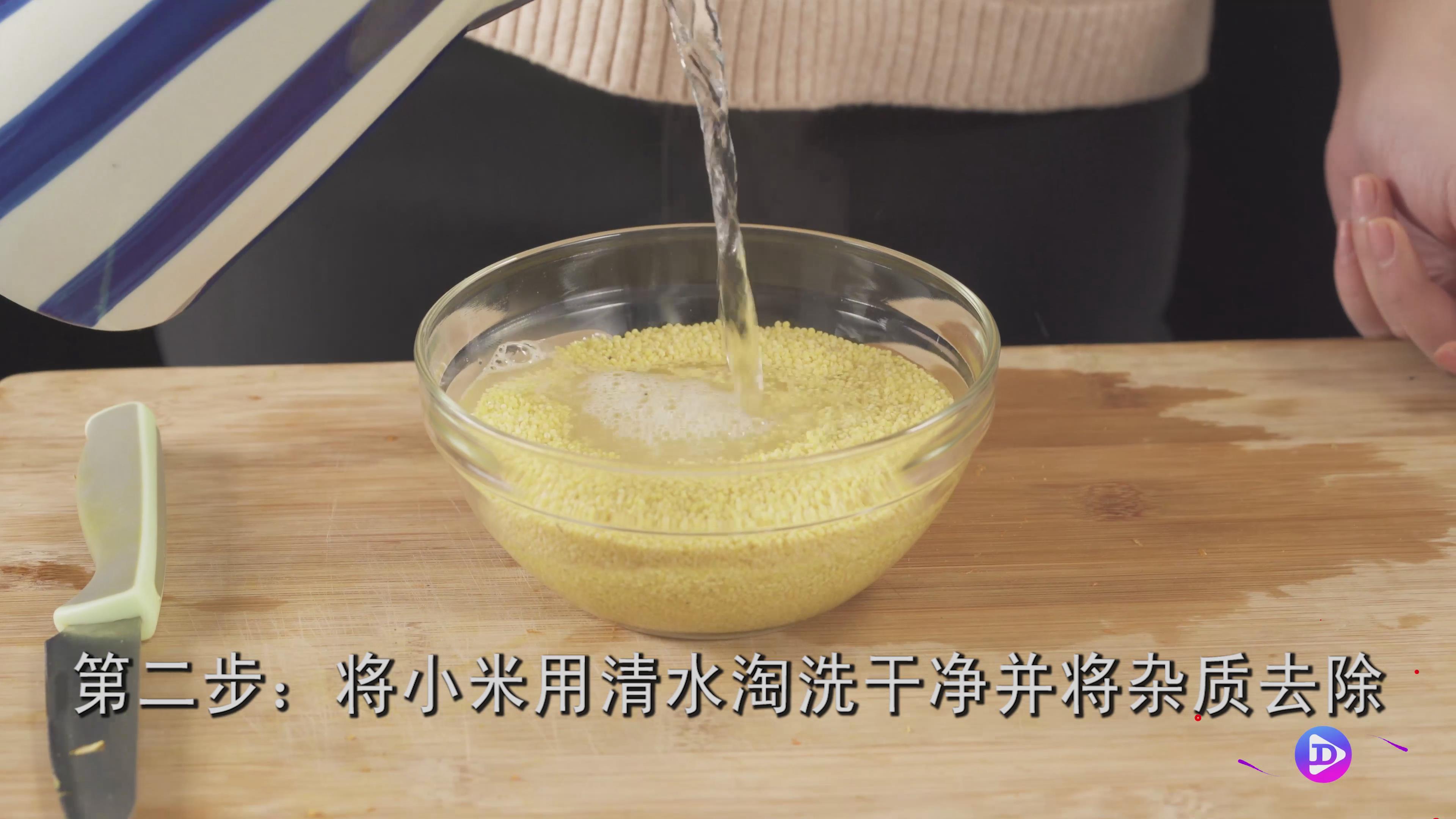 第二步:小米用清水洗净,去除杂质。