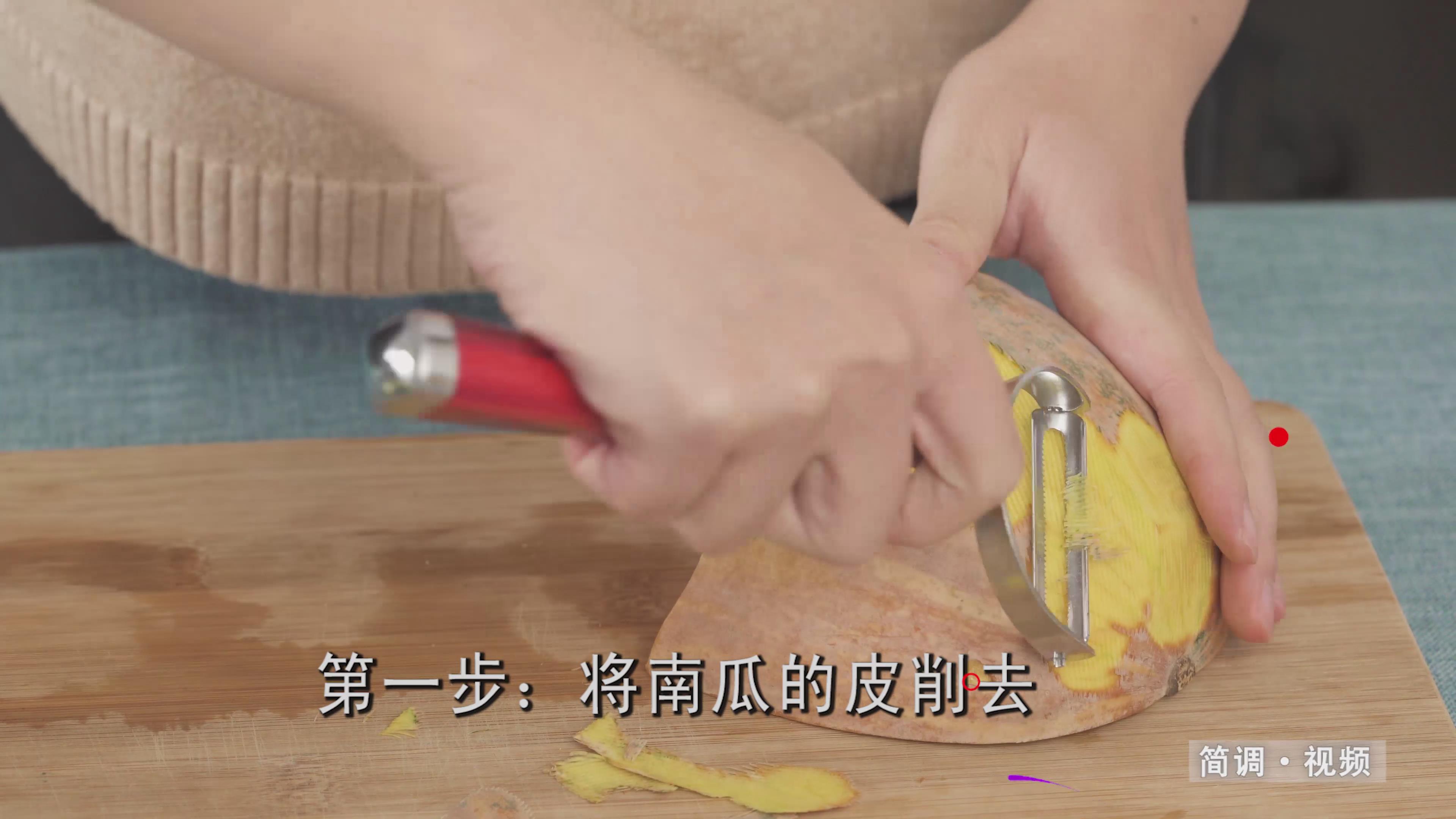 第一步:剥去南瓜的皮,去掉胶囊,切成小块。
