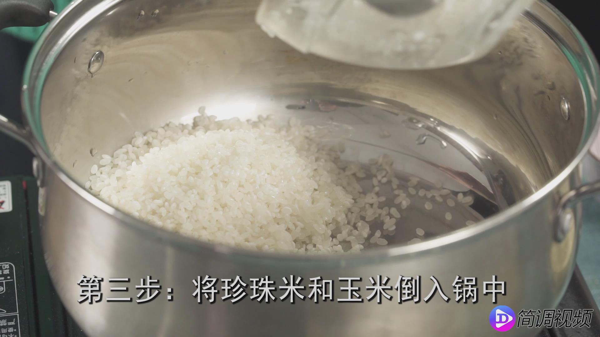 第三步:将珍珠米和玉米倒入锅中,加入糖和水,盖上锅盖,大火煮开。