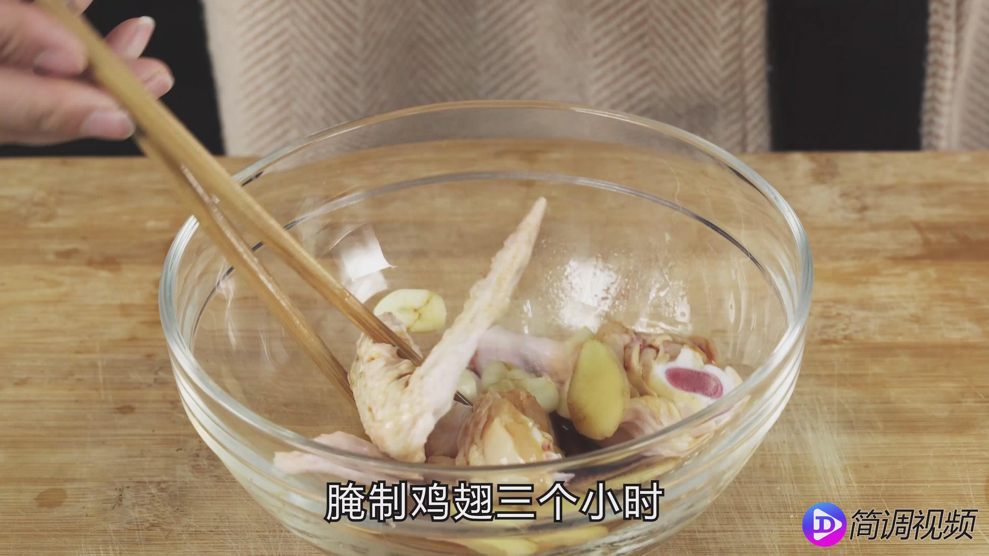 第二步:加入料酒和酱油,放些姜蒜片腌制鸡翅三个小时。