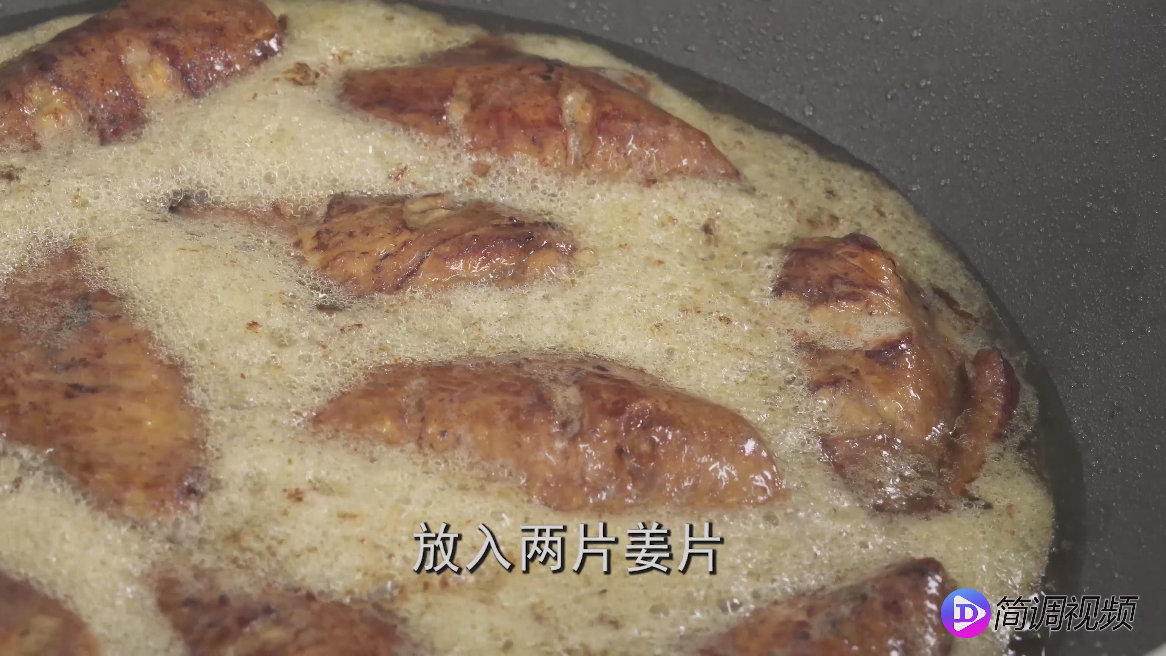 第二步:切两片姜备用,锅中倒油,锅中放少许油,加热,将鸡翅煎至两面金黄。