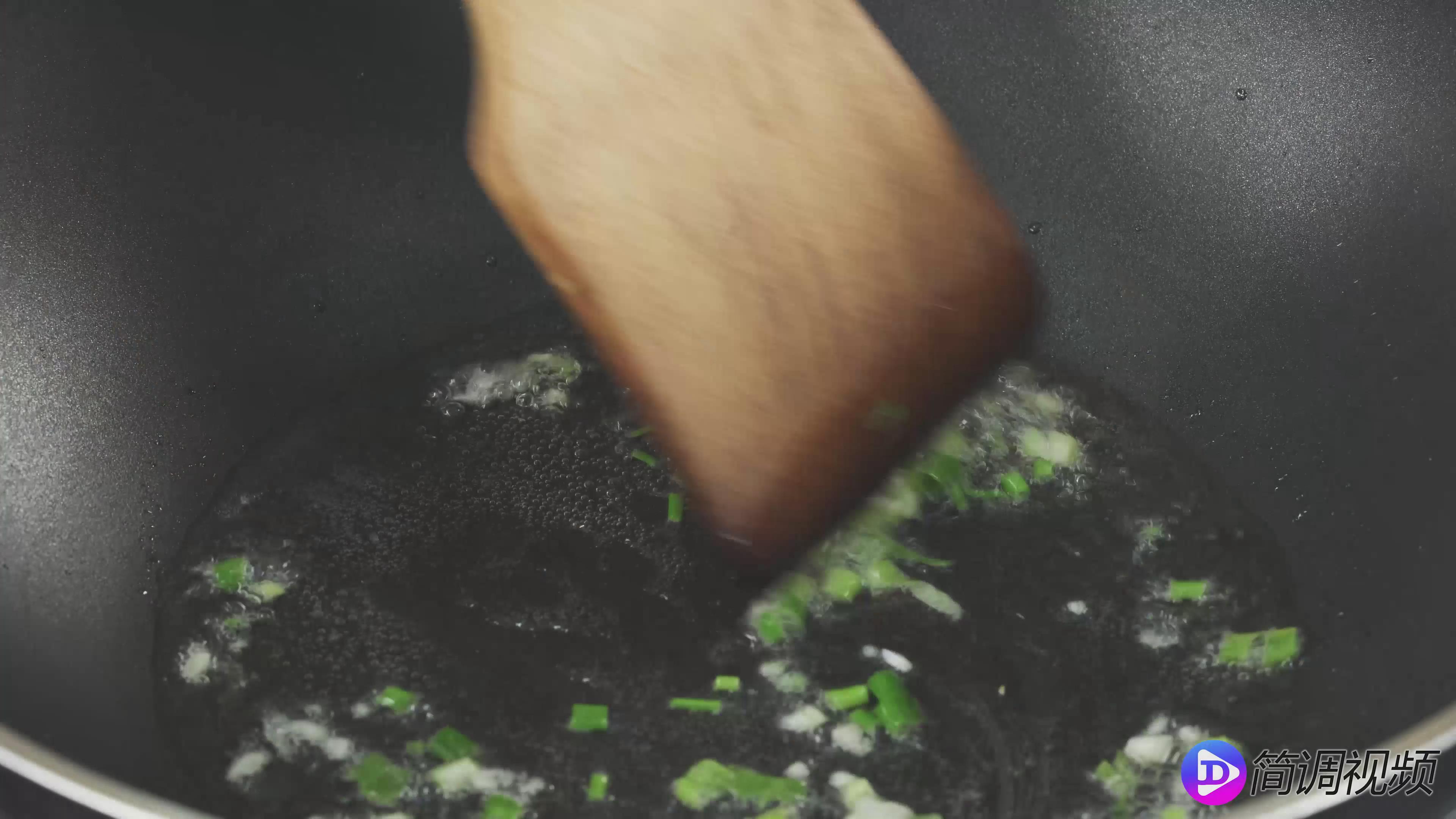 第三步:炒锅倒入适量油,烧热,放入葱花炒香,然后放入肉末,翻炒至变色,再放入酱油、盐、鸡精、料酒略炒。