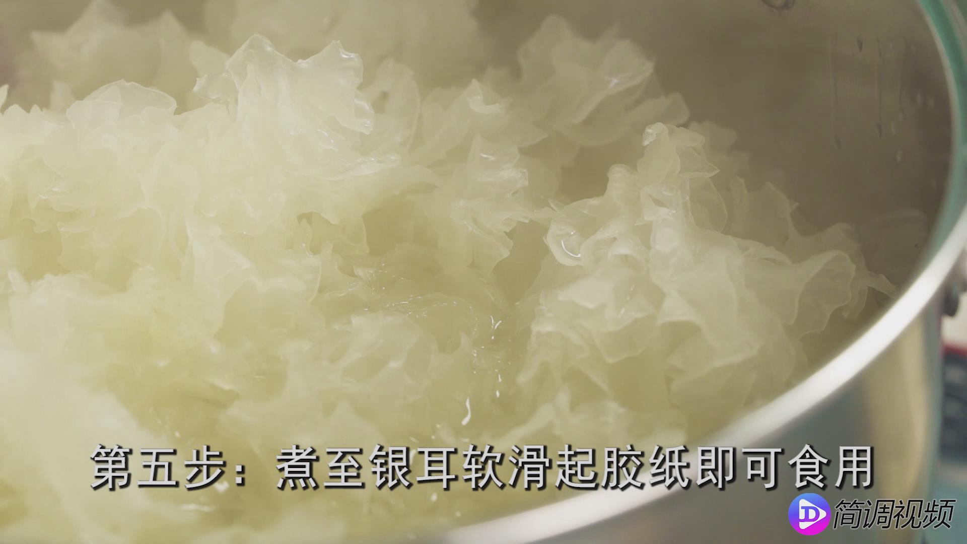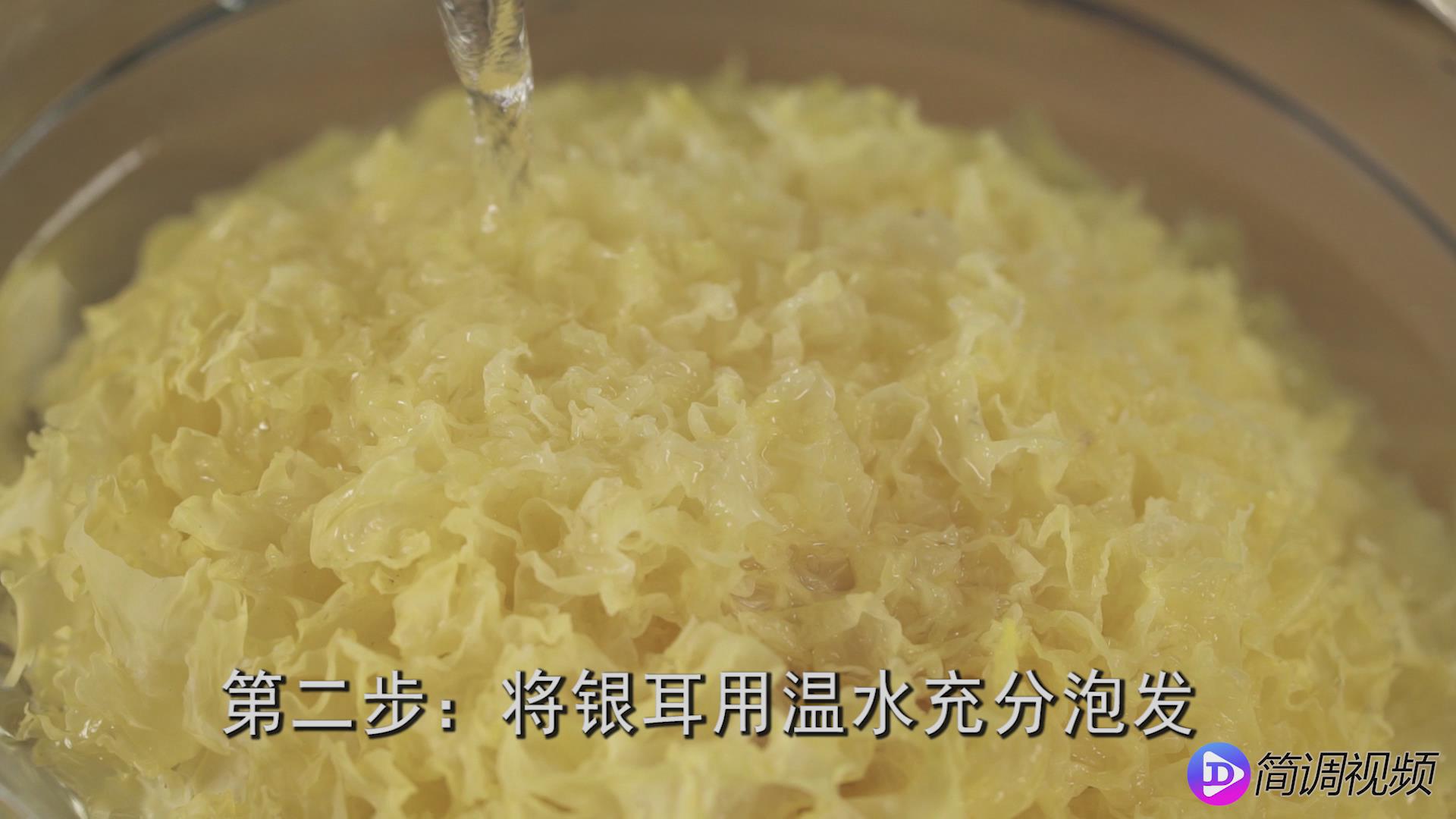 第二步:将银耳用温水浸泡,洗去沉淀物,去掉硬的部分,撕成小朵,沥干水分。