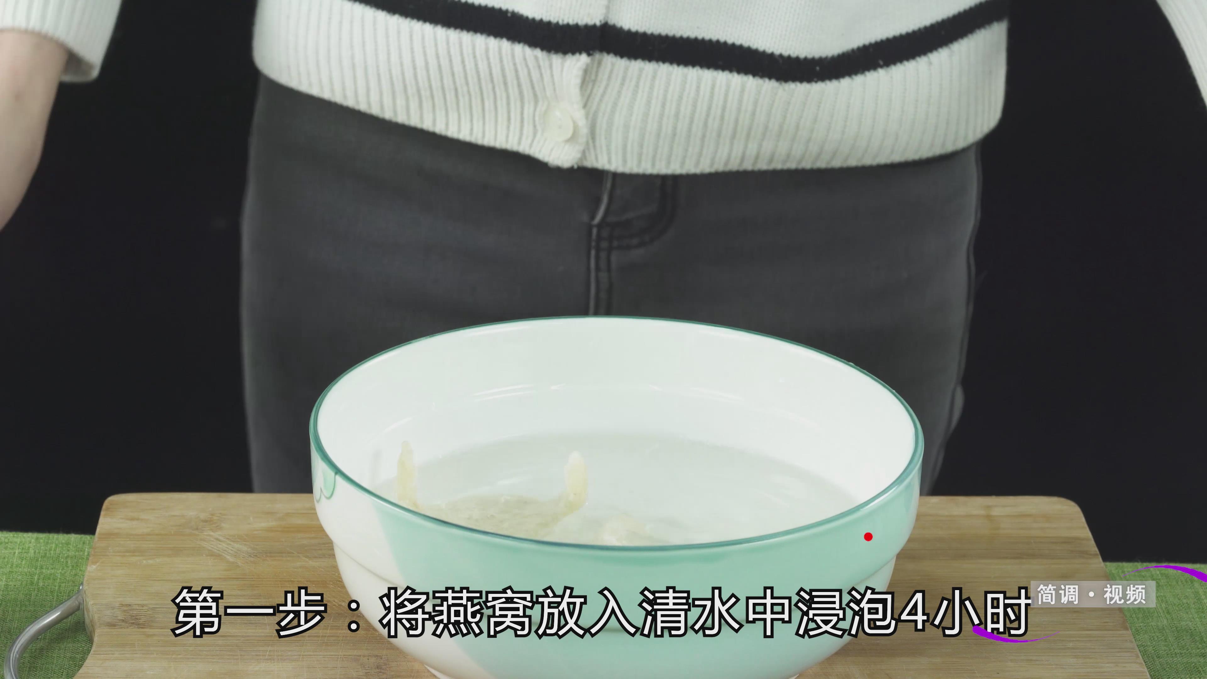 第一步:将燕窝用清水浸泡4小时,然后将浸泡过的燕窝顺着纹理撕成细丝,再用清水洗两遍,去除杂质。